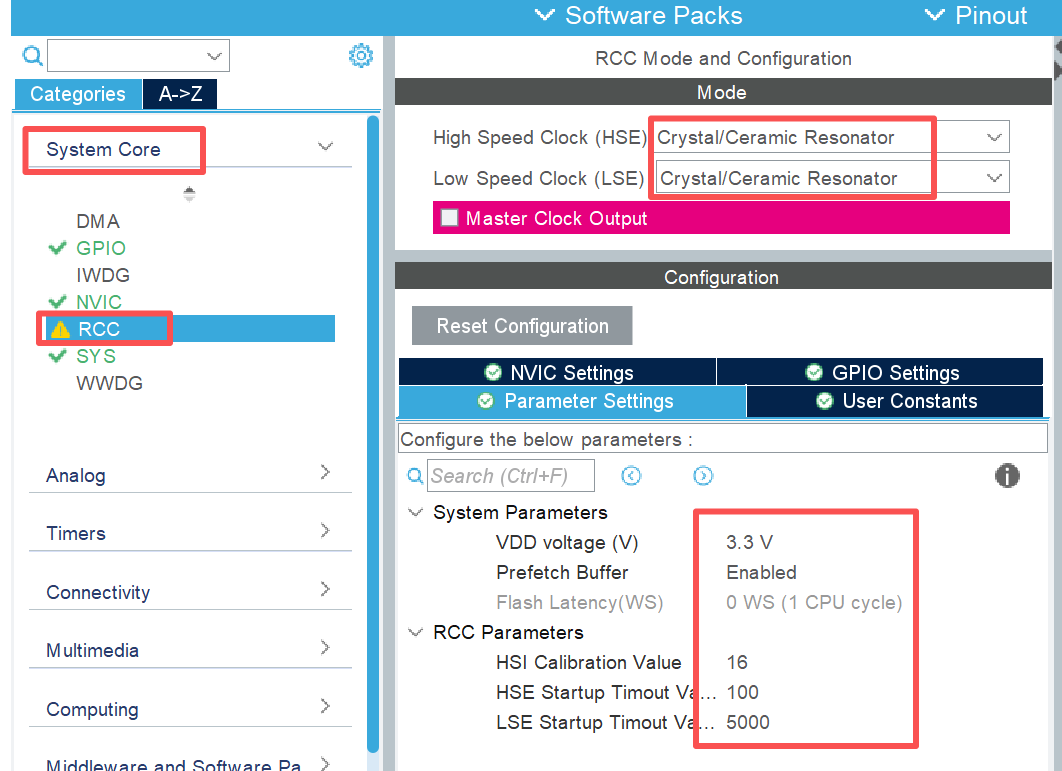 {RCC_OscInitTypeDef RCC_OscInitStruct = {0};RCC_ClkInitTypeDef RCC_ClkInitStruct = {0};/** Initializes the RCC Oscillators according to the specified parameters* in the RCC_OscInitTypeDef structure.*/RCC_OscInitStruct.OscillatorType = RCC_OSCILLATORTYPE_HSI;RCC_OscInitStruct.HSIState = RCC_HSI_ON;RCC_OscInitStruct.HSICalibrationValue = RCC_HSICALIBRATION_DEFAULT;RCC_OscInitStruct.PLL.PLLState = RCC_PLL_NONE;if (HAL_RCC_OscConfig(&RCC_OscInitStruct) != HAL_OK){Error_Handler();}/** Initializes the CPU, AHB and APB buses clocks*/RCC_ClkInitStruct.ClockType = RCC_CLOCKTYPE_HCLK|RCC_CLOCKTYPE_SYSCLK|RCC_CLOCKTYPE_PCLK1|RCC_CLOCKTYPE_PCLK2;RCC_ClkInitStruct.SYSCLKSource = RCC_SYSCLKSOURCE_HSI;RCC_ClkInitStruct.AHBCLKDivider = RCC_SYSCLK_DIV1;RCC_ClkInitStruct.APB1CLKDivider = RCC_HCLK_DIV1;RCC_ClkInitStruct.APB2CLKDivider = RCC_HCLK_DIV1;if (HAL_RCC_ClockConfig(&RCC_ClkInitStruct, FLASH_LATENCY_0) != HAL_OK){Error_Handler();}