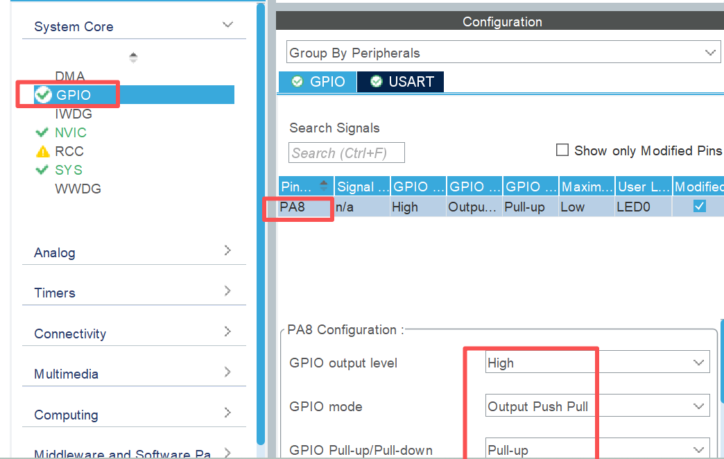 {/* USER CODE BEGIN 1 *//* USER CODE END 1 *//* MCU Configuration--------------------------------------------------------*//* Reset of all peripherals, Initializes the Flash interface and the Systick. */HAL_Init();/* USER CODE BEGIN Init *//* USER CODE END Init *//* Configure the system clock */SystemClock_Config();/* USER CODE BEGIN SysInit *//* USER CODE END SysInit *//* Initialize all configured peripherals */MX_GPIO_Init();MX_USART1_UART_Init();/* USER CODE BEGIN 2 */printf("******* LED Control Demo *******\r\n");printf("open--------open LD2\r\n");printf("close-------close LD2\r\n");printf("Please input your choice:\r\n");/* USER CODE END 2 *//* Infinite loop *//* USER CODE BEGIN WHILE */while (1){/* USER CODE END WHILE *//* USER CODE BEGIN 3 */if(scanf("%s",RxBuffer) == 1) //读取到有效数据{if(strcmp((const char *)RxBuffer,"open") == 0) //开启指示灯{printf("Open LED!\r\n");HAL_GPIO_WritePin(GPIOA,GPIO_PIN_8,GPIO_PIN_RESET);}else if(strcmp((const char *)RxBuffer,"close") == 0) //关闭指示灯{printf("Close LED!\r\n");HAL_GPIO_WritePin(GPIOA,GPIO_PIN_8,GPIO_PIN_SET);}else //输入预期外的指令判定为错误{printf("Input error,Please input again:\r\n");}}}/* USER CODE END 3 */