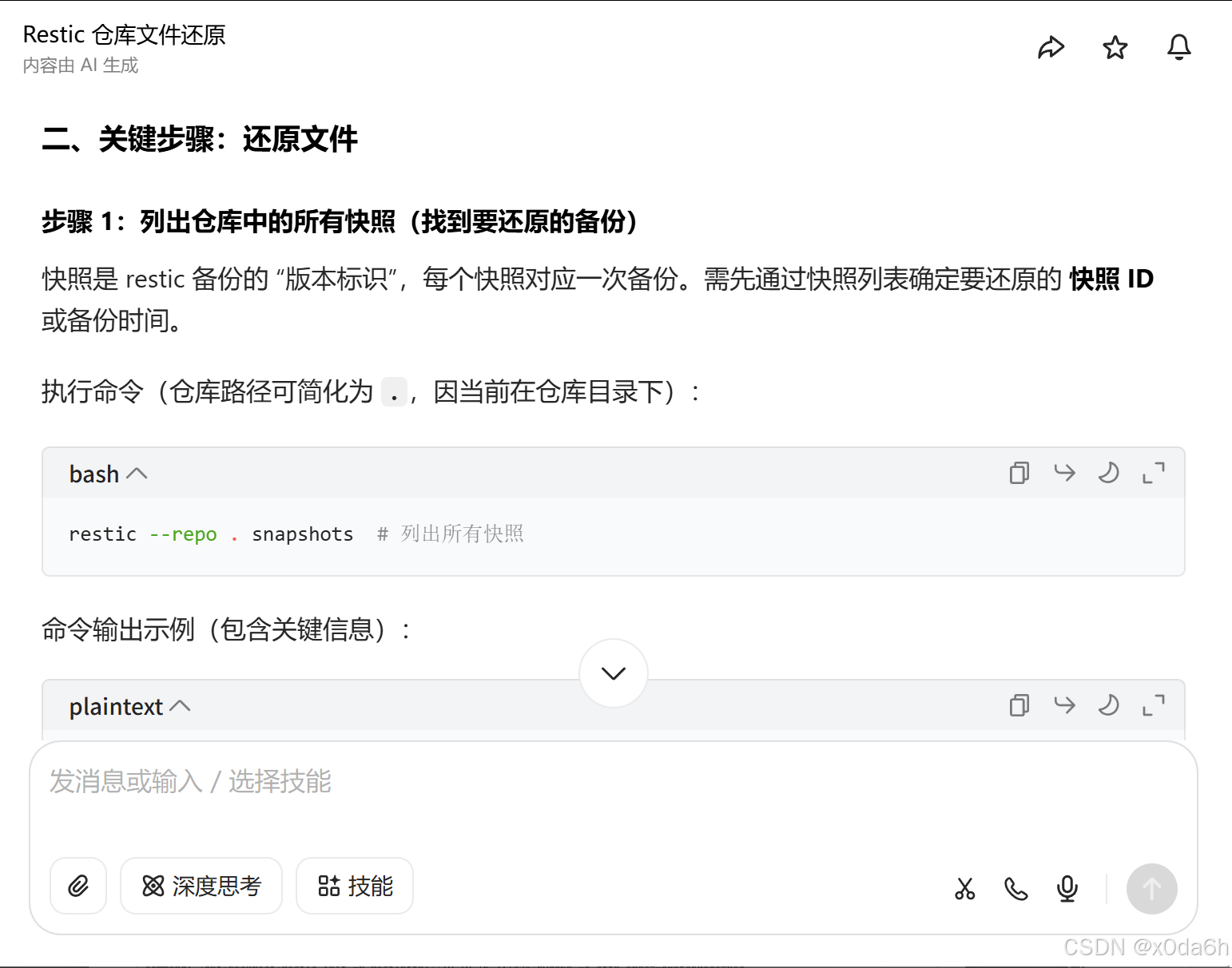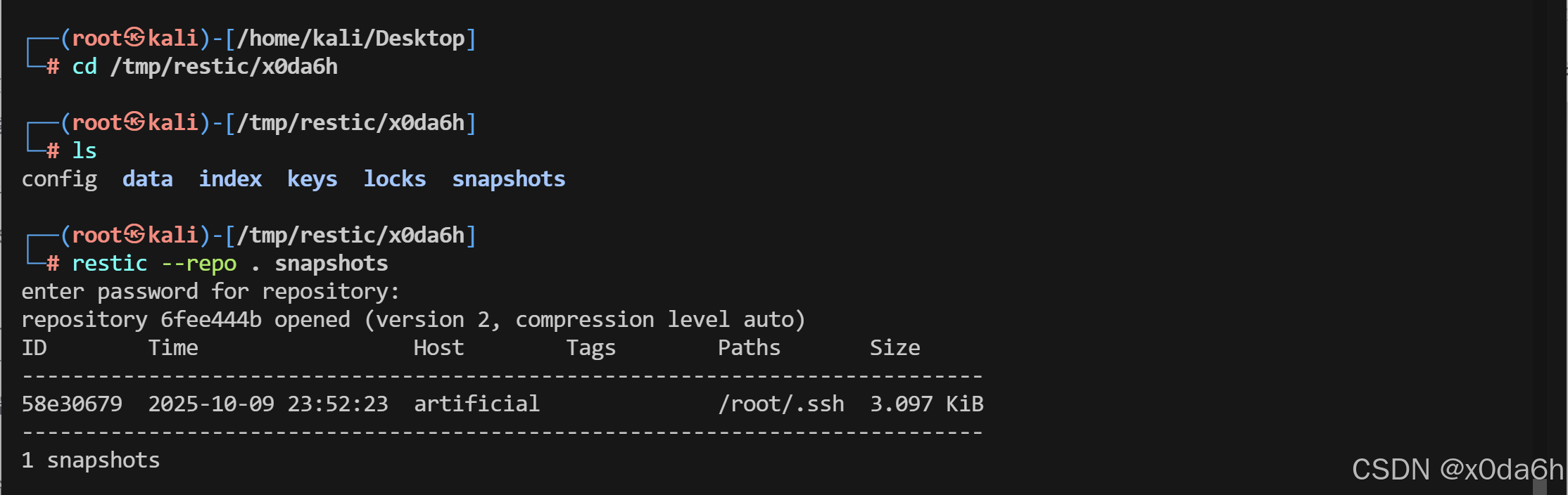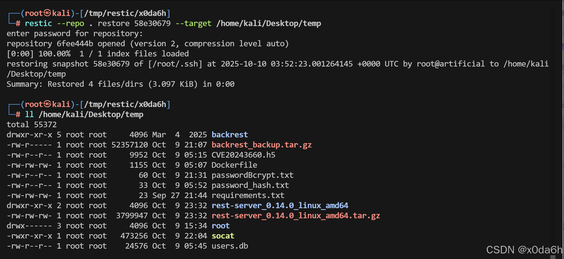restic --repo . restore 58e30679 --target /home/kali/Desktop/temp