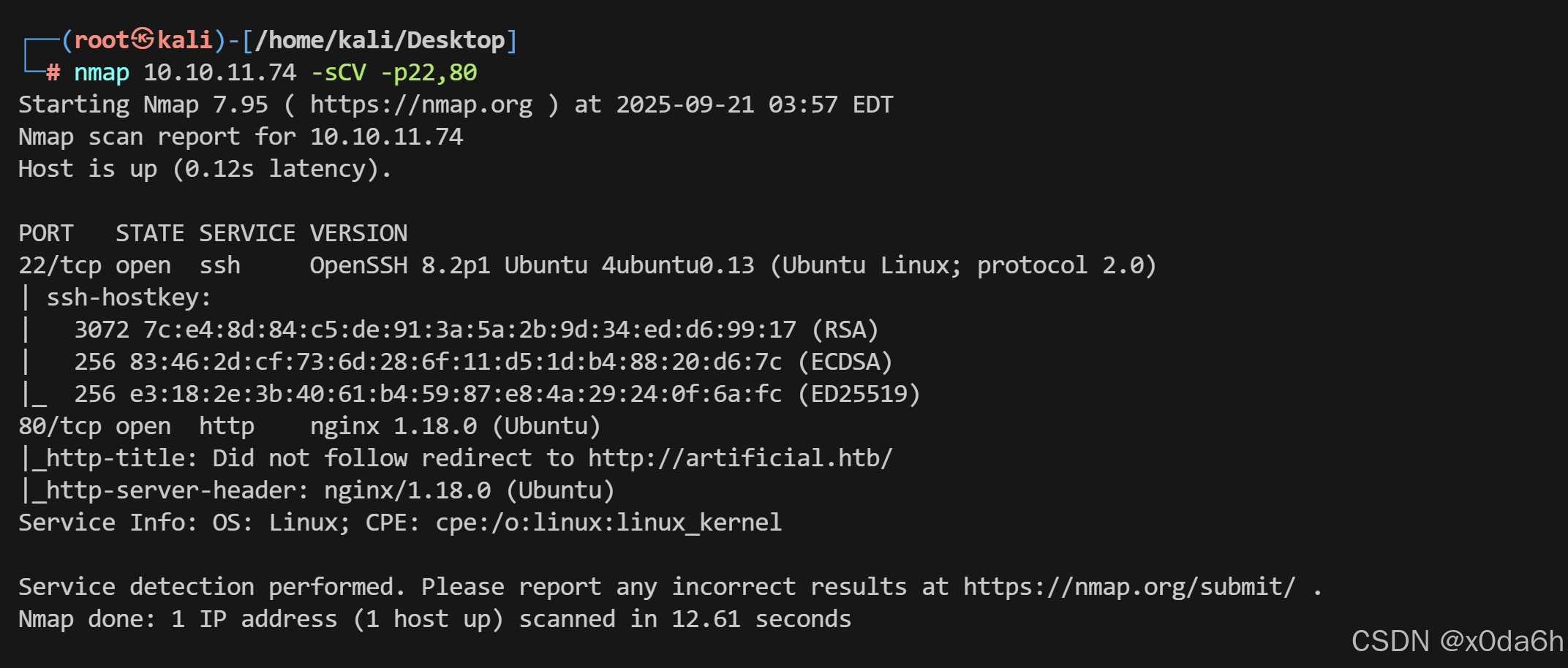 使用nmap对靶机TCP开放端口进行脚本、版本扫描