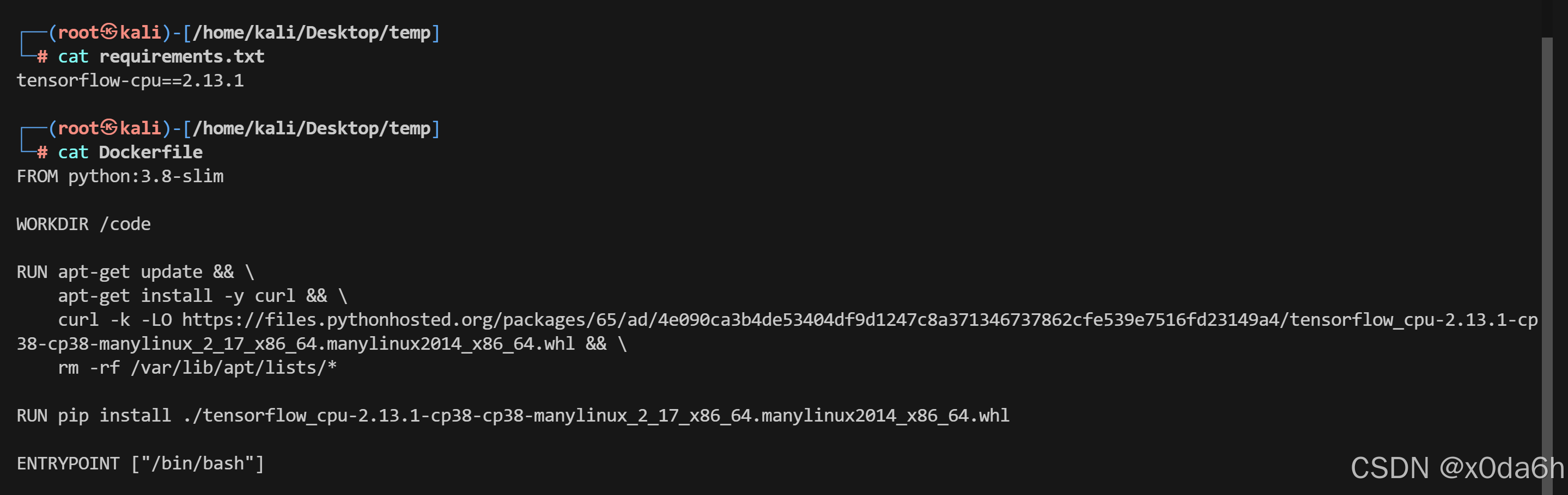 WORKDIR /codeRUN apt-get update && \apt-get install -y curl && \curl -k -LO https://files.pythonhosted.org/packages/65/ad/4e090ca3b4de53404df9d1247c8a371346737862cfe539e7516fd23149a4/tensorflow_cpu-2.13.1-cp38-cp38-manylinux_2_17_x86_64.manylinux2014_x86_64.whl && \rm -rf /var/lib/apt/lists/*RUN pip install ./tensorflow_cpu-2.13.1-cp38-cp38-manylinux_2_17_x86_64.manylinux2014_x86_64.whlENTRYPOINT ["/bin/bash"]
