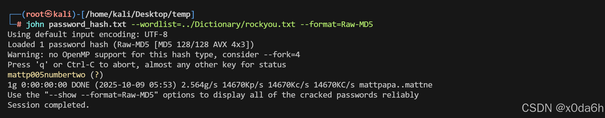 john password_hash.txt --wordlist=../Dictionary/rockyou.txt --format=Raw-MD5