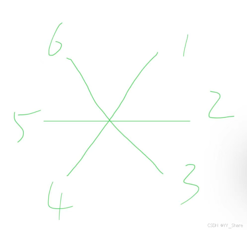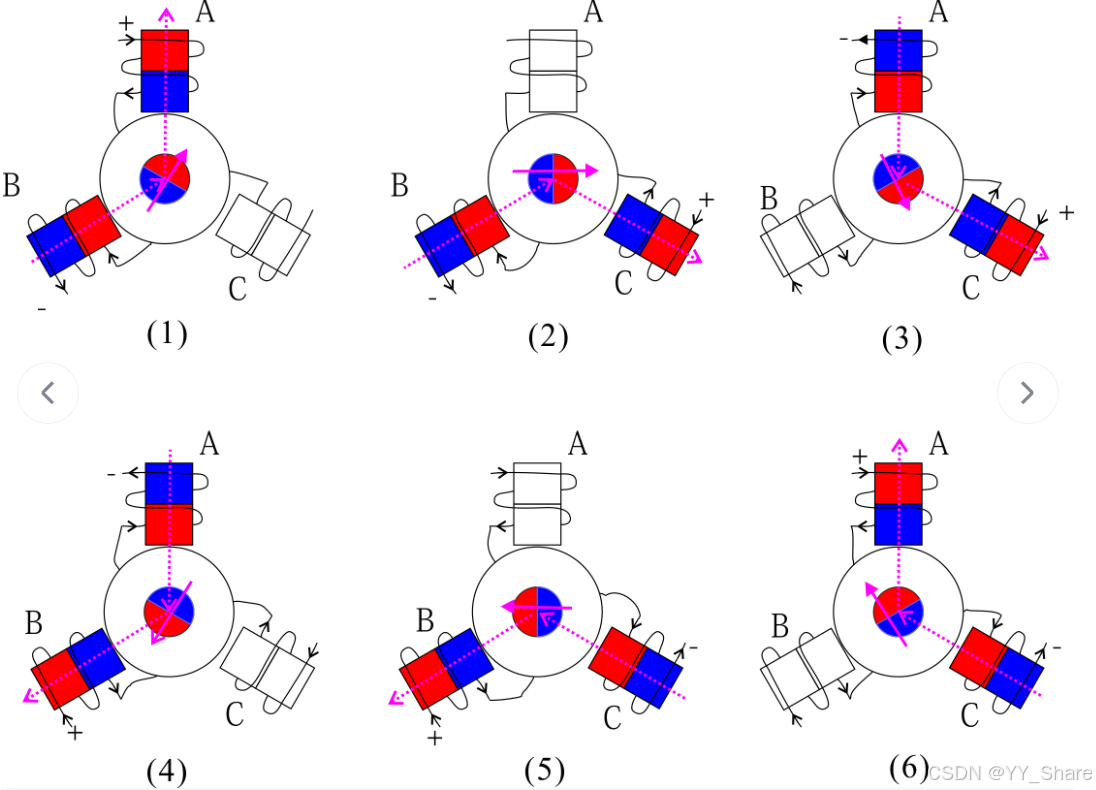 在平面上的三相绕组,最简单的,我们能产生六个方向的磁场,间距60°,这很简单,也是著名的六步换相。只要切换逆变器按照顺序切换,将合成的磁场方向旋转起来,可以联想到,永磁体也会跟着旋转起来。但很明显这样的控制方式,太粗糙,360°只用了其中六个方向,电机转起来也会有一格一格的抖动感,不够细腻,参考下图