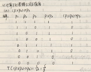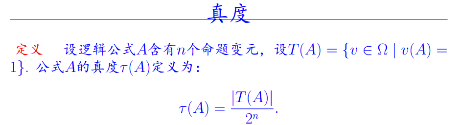~对图片中真度,换一种方式解释,列出某式A的真值表,选出值为1的,称之为真,作为真度的分子;A中若是有n个命题变元,则设置真度的分母为2^n。则像这样的分式就是该式子A的真度。