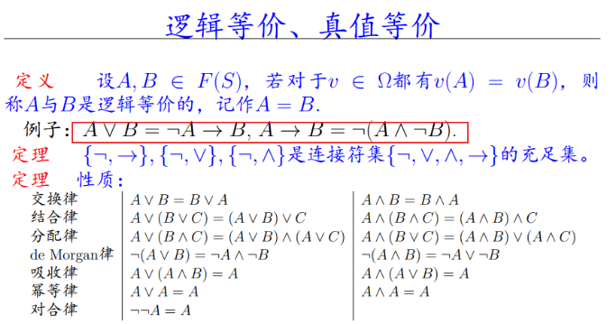 这个地方主要是将或运算,与运算和蕴含(→)串联起来进行运算,原理是命题变元取一样的值,最后运算的结果一致。比如在求取某式子的析取合取范式时,将式子中出现的蕴含符号消去,运算后化成范式的标准形式。 在运算过程中可以使用离散数学中的一些定理简化运算。