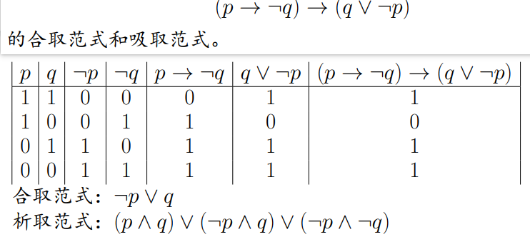 最后这个定理表明,析取范式是一个永真式(1),在求取过程中,列出真值表,将最后真值为1的式子全部使用逻辑或(∨)连接起来。合取范式是一个矛盾式(0),在求取过程中,列出真值表,将最后真值为0的式子全部使用逻辑与(∧)连接起来。