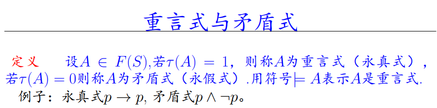 简而言之,对于某式子,无论式子中各个命题变元取什么值,式子恒为1,则说明该式子为重言式(永真)。无论式子中各个命题变元取什么值,式子恒为0,则说明该式子为矛盾式(永假)。一般来说,某式子对于命题变元取不同的值,会有不同的结果,或真(1),或假(0)。