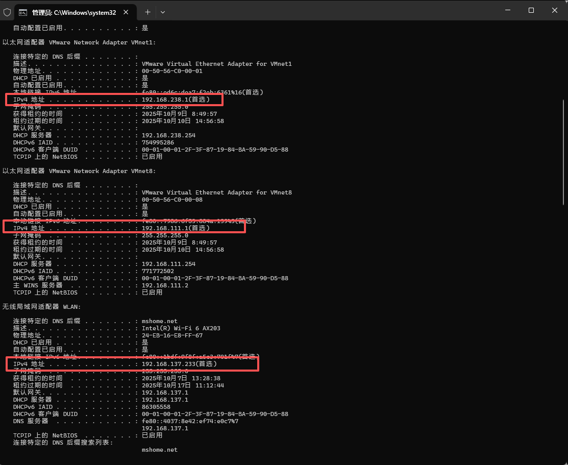 192.168.238.1(虚拟机1)192.168.111.1(虚拟机2) 192.168.137.233(WIFI )