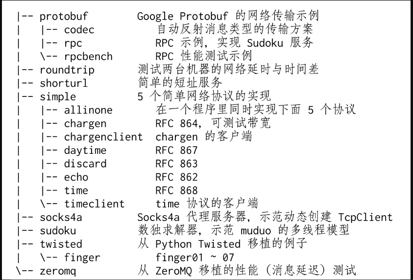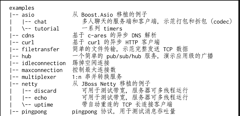 muduo附带了十几个示例程序,编译出来有近百个可执行文件。这些例子位于examples目录,其中包括从Boost.Asio、Java Netty、Python Twisted等处移植过来的例子。这些例子基本覆盖了常见的服务端网络编程功能点,从这些例子可以充分学习非阻塞网络编程。