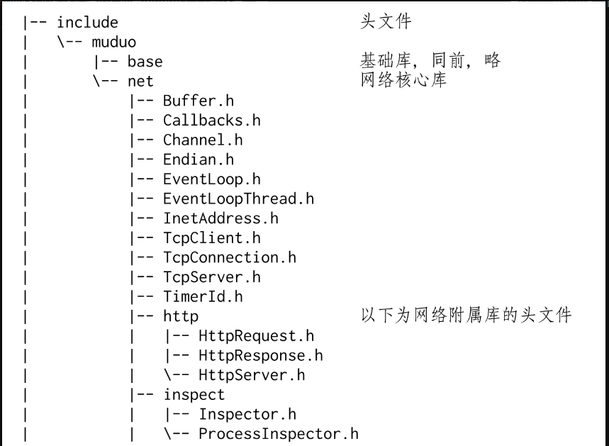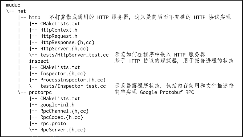 附属模块位于muduo/net/{http,inspect,protorpc}等处。