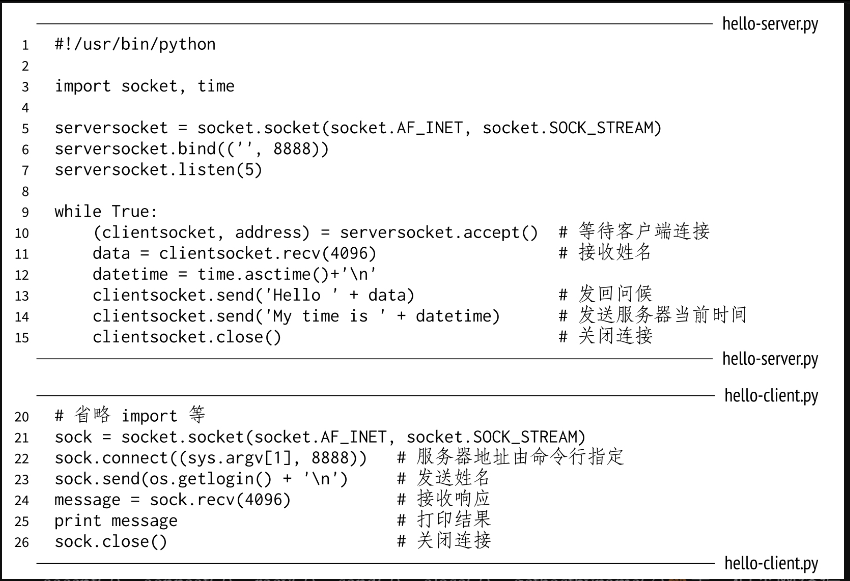 使用Sockets API进行网络编程是很容易上手的一项技术,花半天时间读完一两篇网上教程,相信不难写出能相互连通的网络程序。例如下面这个网络服务端和客户端程序,它用Python实现了一个简单的“Hello”协议,客户端发来姓名,服务端返回问候语和服务器的当前时间。
