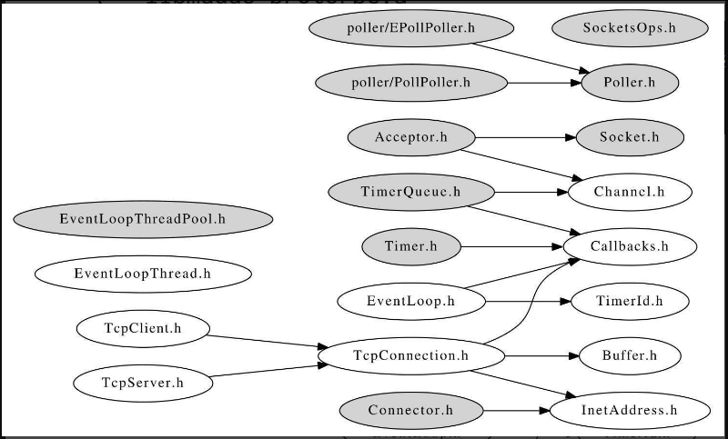 图6-1是muduo的网络核心库的头文件包含关系,用户可见的为白底,用户不可见的为灰底。