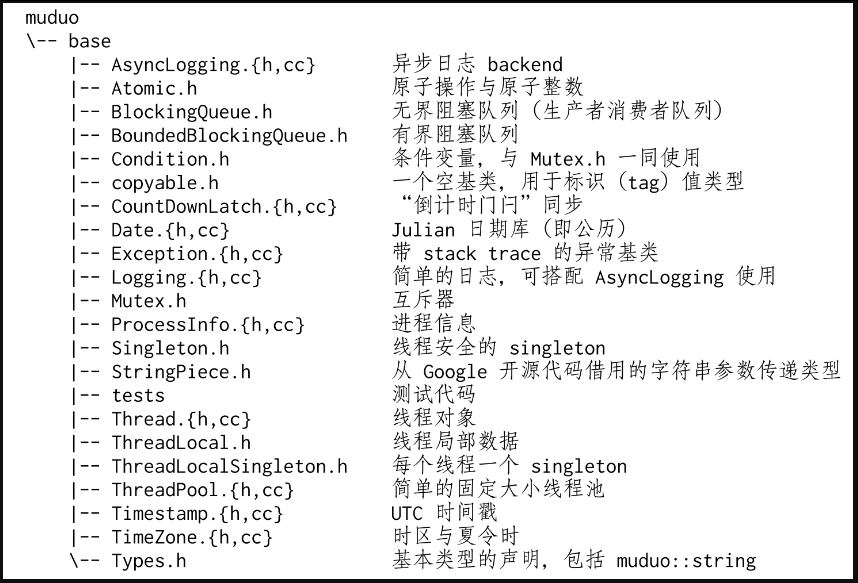 muduo的源代码文件名与class名相同,例如ThreadPool class的定义是muduo/base/ThreadPool.h,其实现位于muduo/base/ThreadPool.cc。