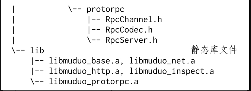 muduo的头文件明确分为客户可见和客户不可见两类。以下是安装之后暴露的头文件和库文件。对于使用muduo库而言,只需要掌握5个关键类:Buffer、EventLoop、TcpConnection、TcpClient、TcpServer。