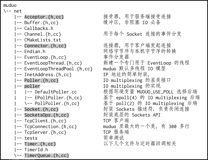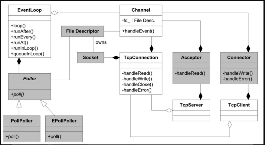 网络库核心位于muduo/net和muduo/net/poller,一共不到4300行代码,以下灰底表示用户不可见的内部类。