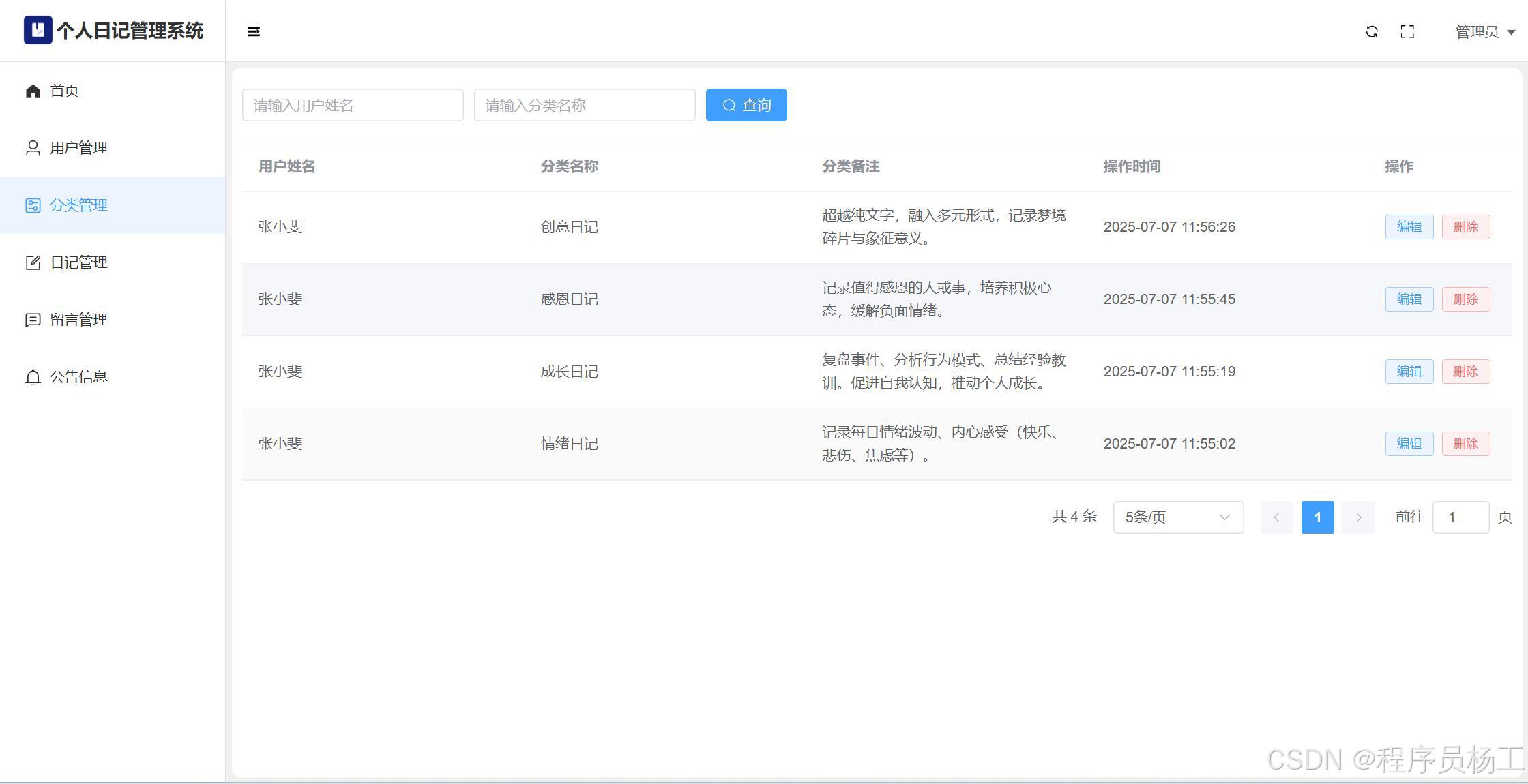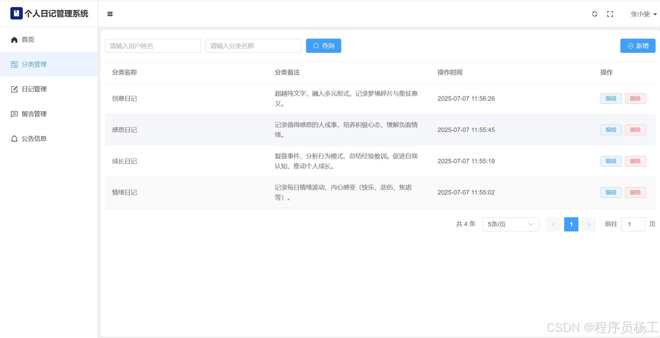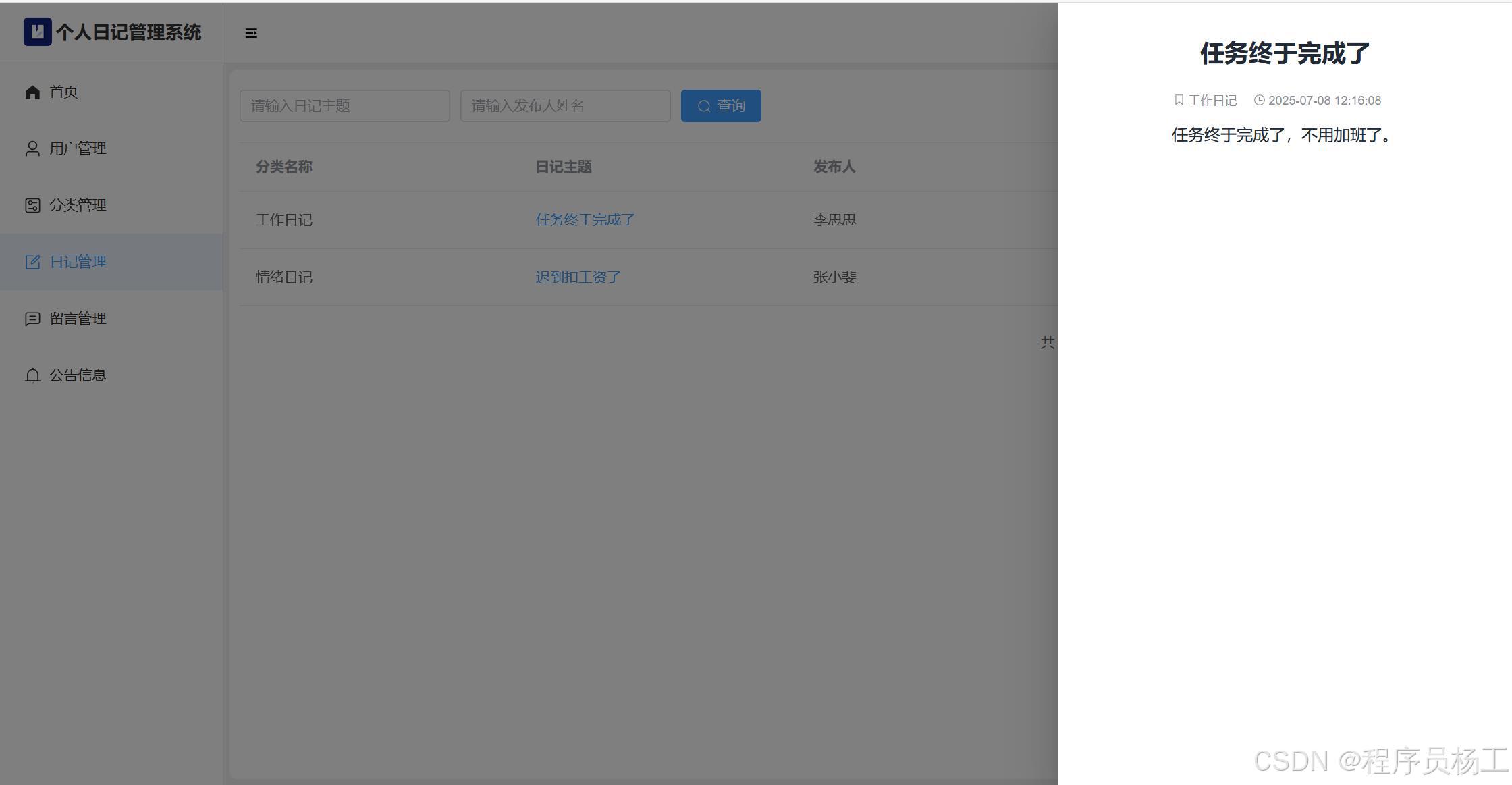 基于SpringBoot3+Vue3前后端分离的个人日记管理系统,系统包含管理员、用户角色,功能如下:管理员:用户管理;分类管理;日记管理;留言管理;公告信息;个人信息;密码修改;