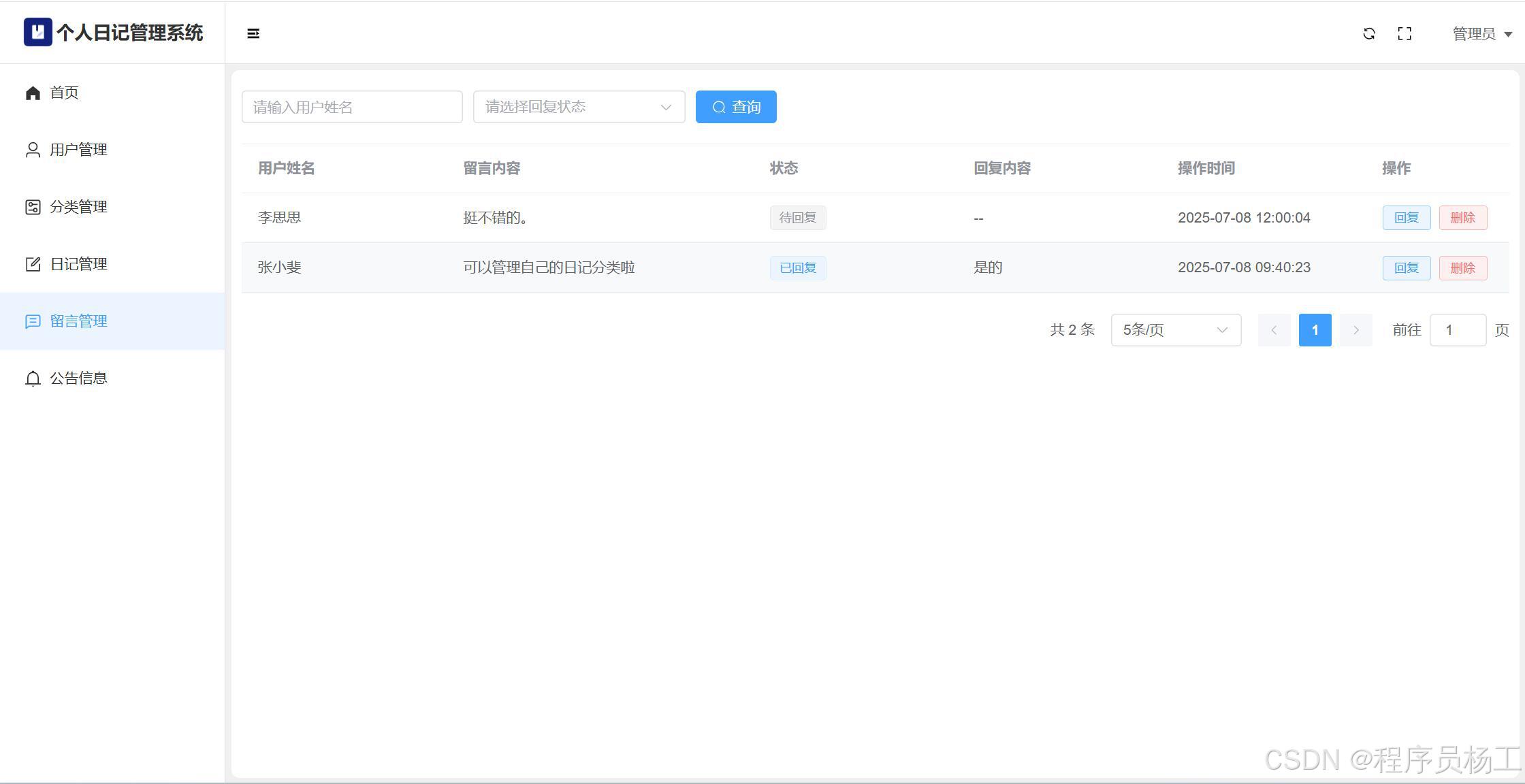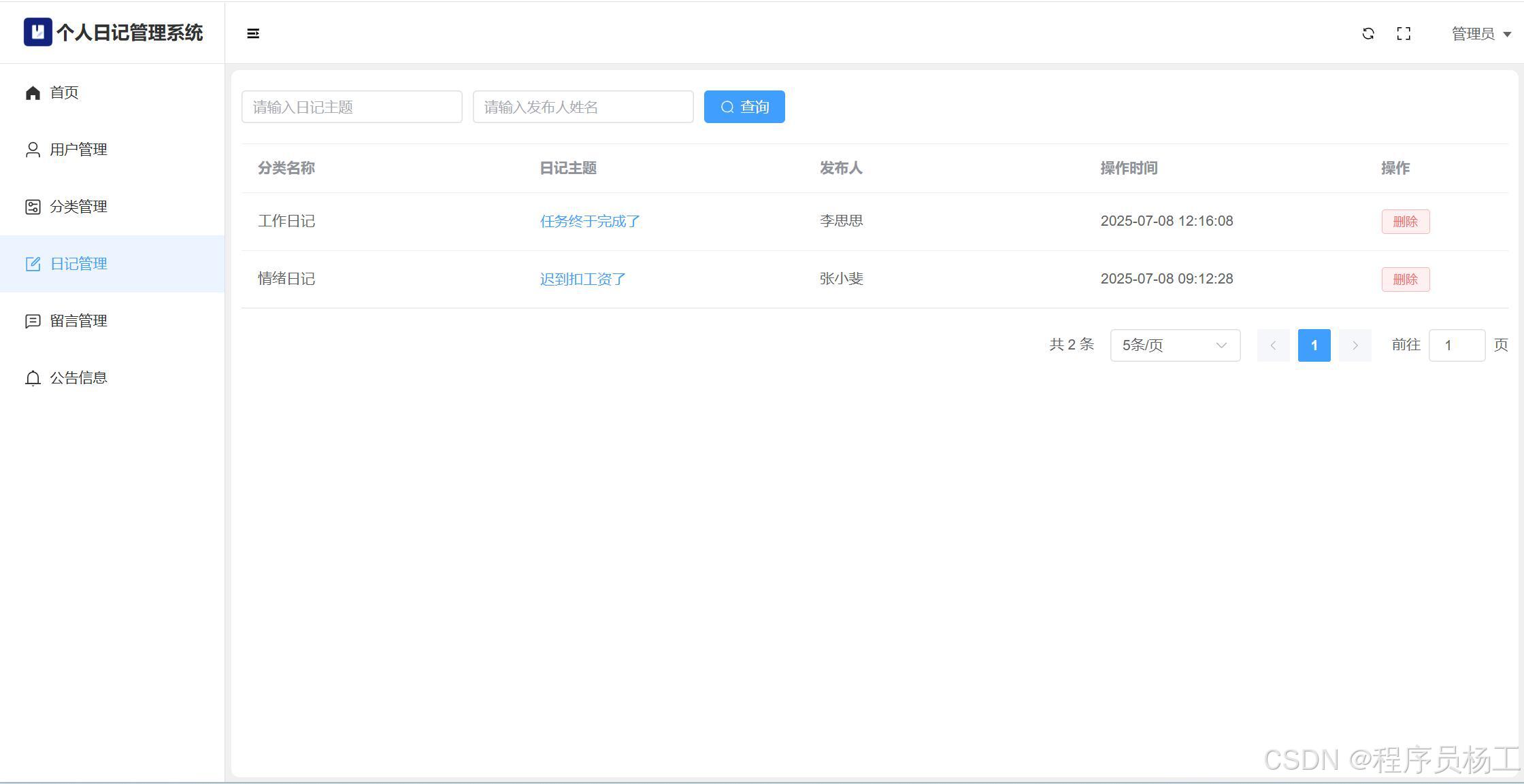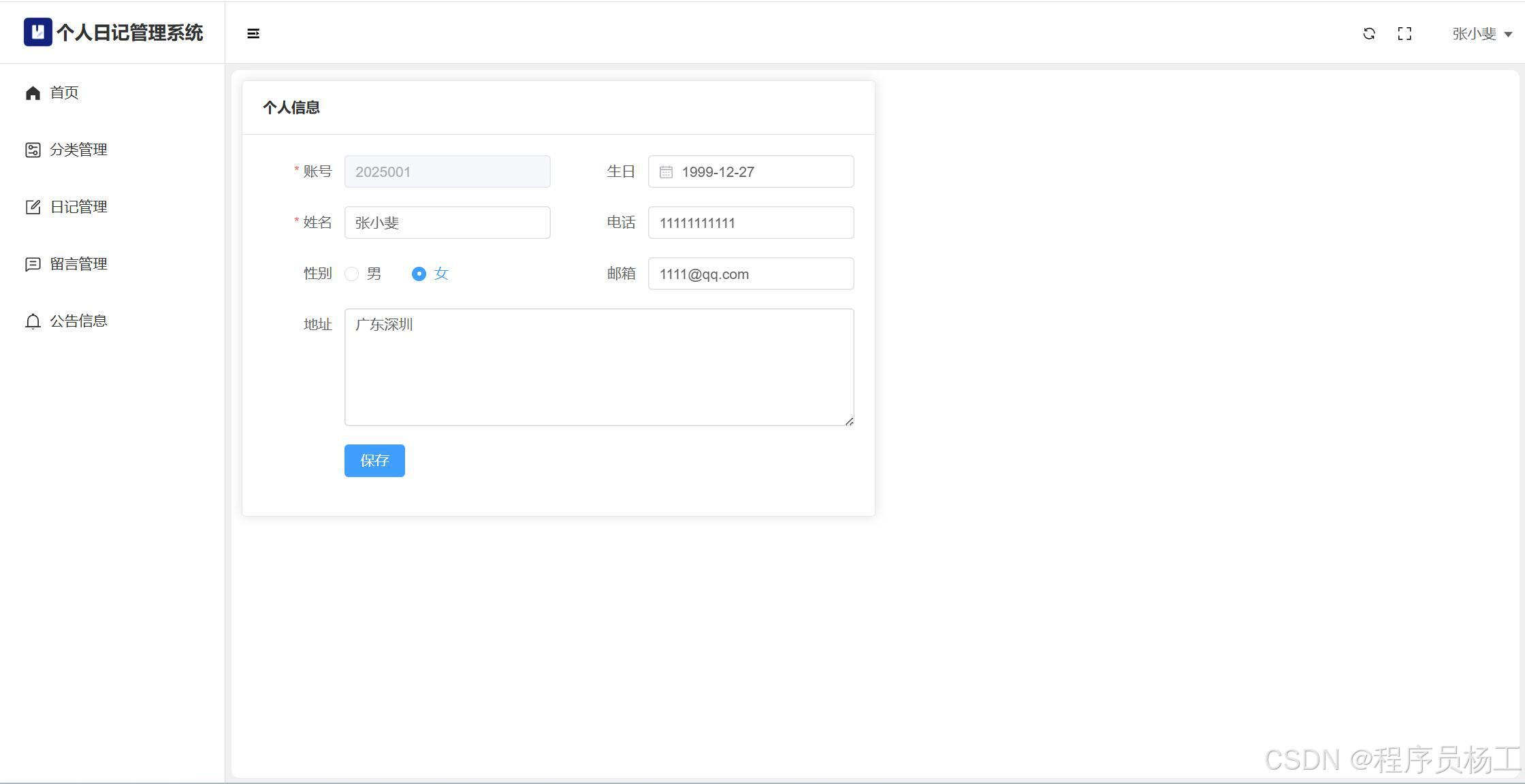 基于SpringBoot3+Vue3前后端分离的个人日记管理系统,系统包含管理员、用户角色,功能如下:管理员:用户管理;分类管理;日记管理;留言管理;公告信息;个人信息;密码修改;
