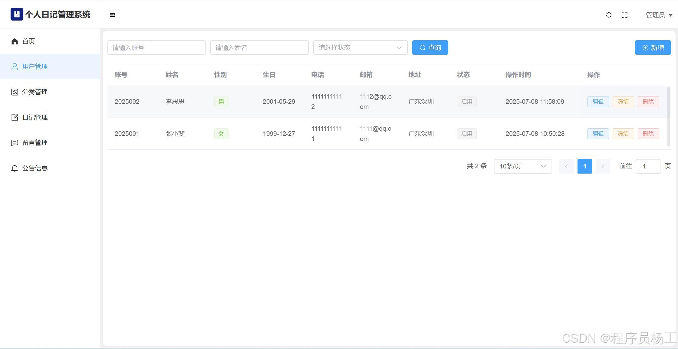 基于SpringBoot3+Vue3前后端分离的个人日记管理系统,系统包含管理员、用户角色,功能如下: