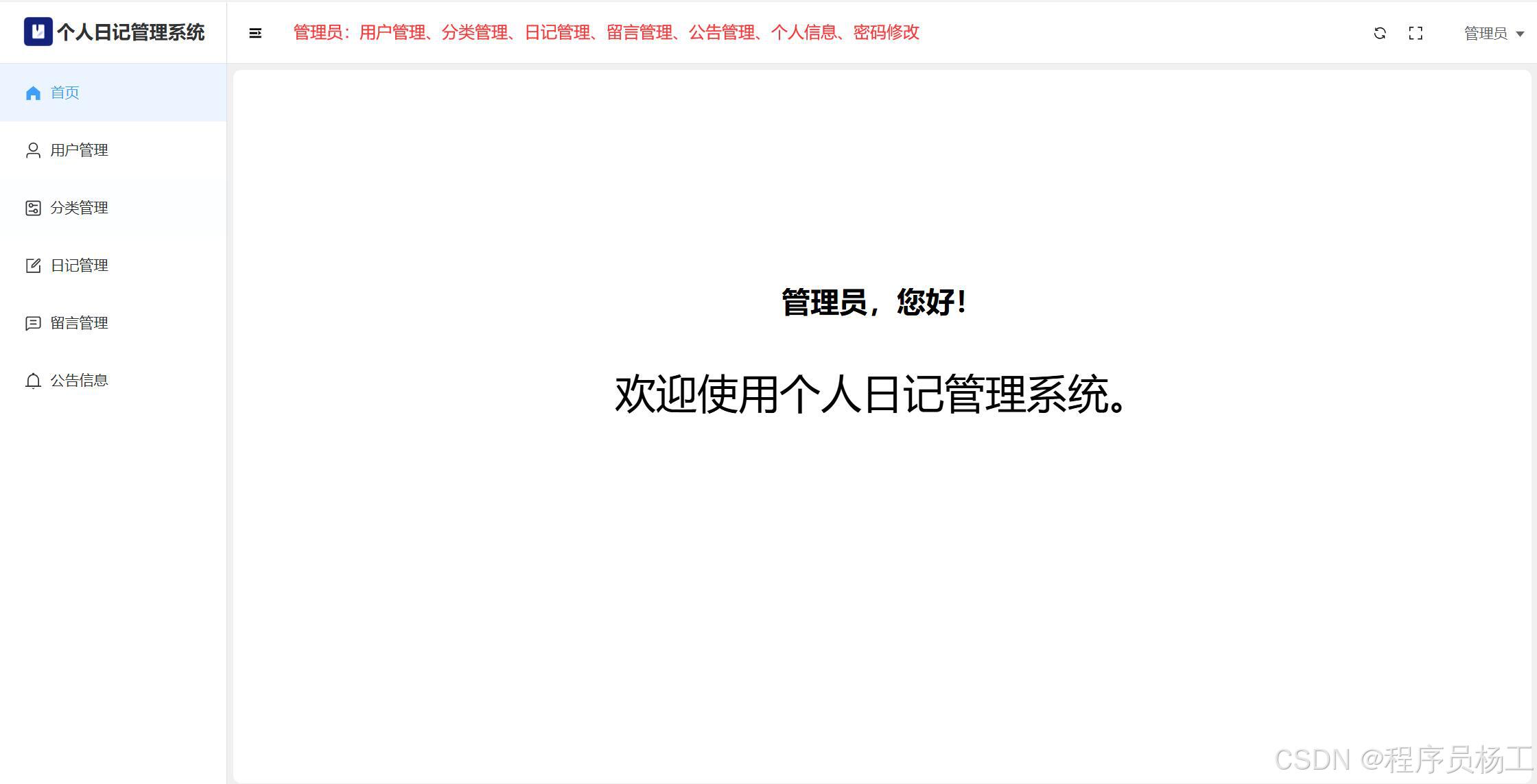 管理员:用户管理;分类管理;日记管理;留言管理;公告信息;个人信息;密码修改;