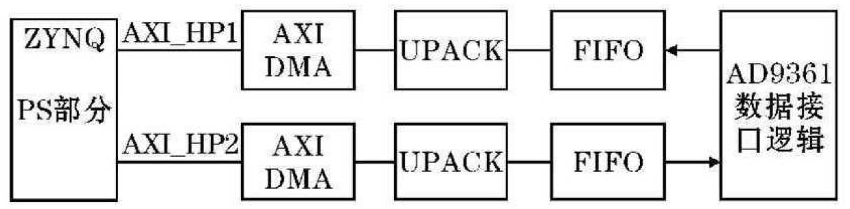 将4个16位数据进入DAC-FIFO缓存, 缓存后输入AD9361中进行射频发射,AD9361在接收端接收到回波信号后, 将信号转换位4个16位的I/Q数据, 将数据送人接收adc-fifo中进行缓存, 缓存后输人adc-pck模块中, 打包为1个64位的数据送人ADC的DMA模块中完成数据的传输。