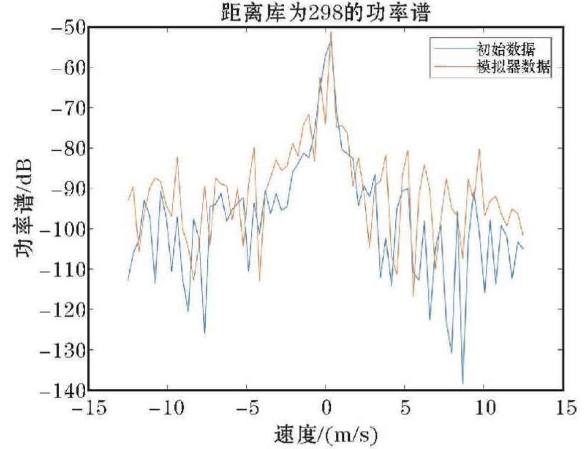 从图中可以看出模拟回波信号谱峰位置和谱宽分布具有较好的一致性; 当然, 从功率谱中也可发现, 由于AD9361的DA位数有限引起的量化噪声, 造成功率谱的噪声基底变高, 并未与原始功率谱完全一致, 而且在中心谱出现一些幅度波动, 这可能会给速度及谱宽带来的一定的影响。