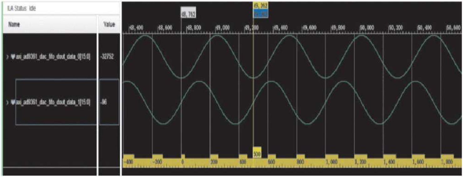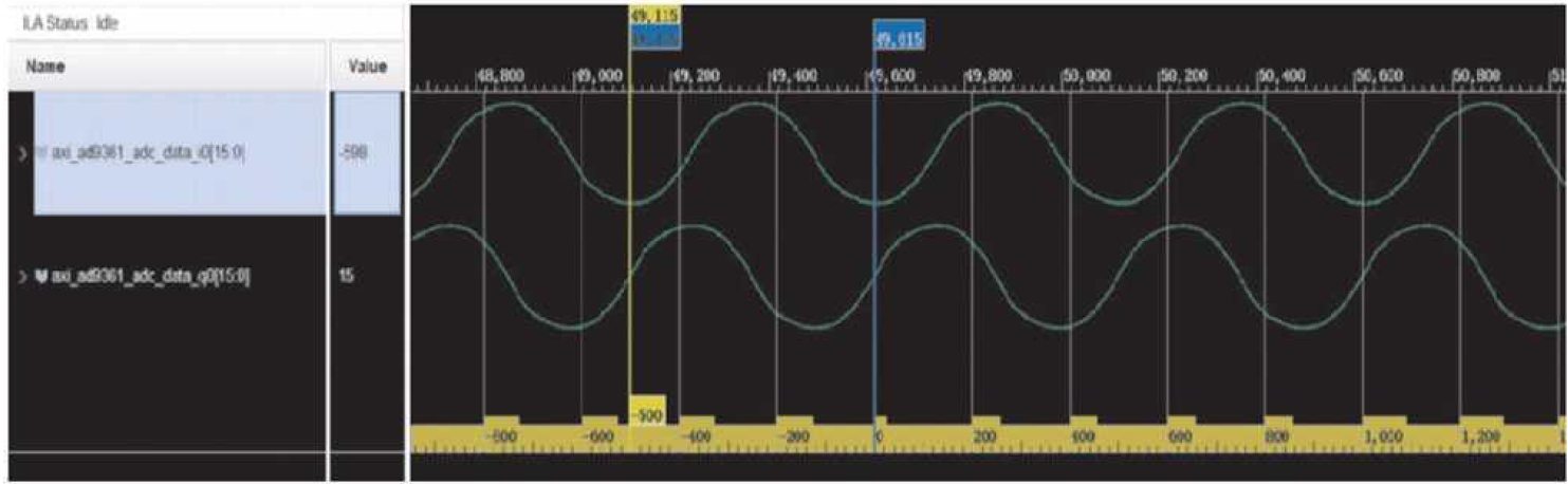 (2) 采用单一正弦波自发自收的验证方式, 用SMA射频线将发射通道与接收通道相连, 通过VIVADO软件的ILA调试工具抓取发射与接收的基带I/Q信号进行分析, 对硬件平台的接收通道进行测试。