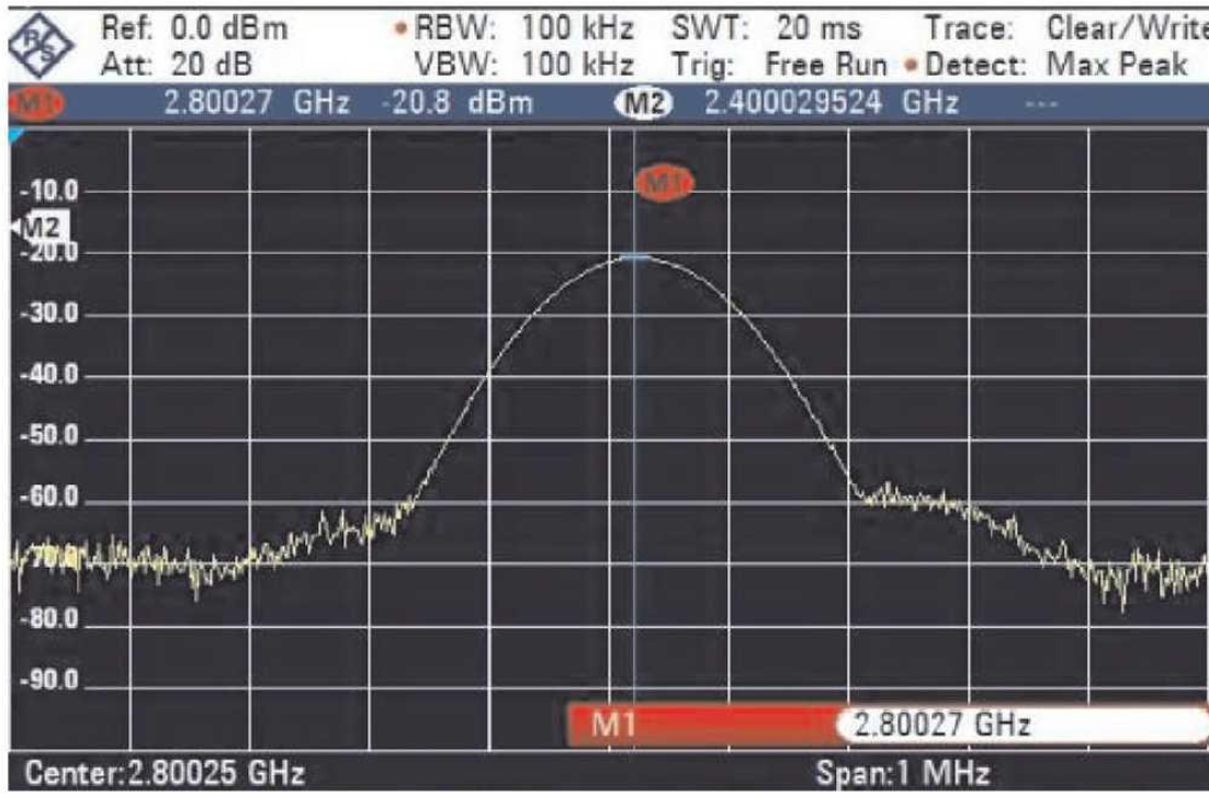 观测到的频率为2.80027GHz,与设定的频率基本一致, 可见射频信号产生正常.