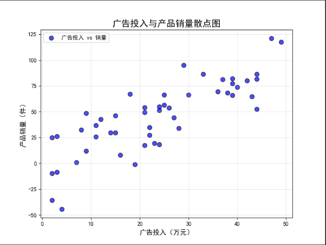 plt.scatter(x, y,s=60, # 每个点的大小c='blue', # 每个点的颜色(可设为列表实现多色)alpha=0.7, # 透明度(0透明 ~ 1不透明)marker='o', # 点的形状,'o'是圆点,也可以是 's'(方块)、'^'(三角)等edgecolors='black', # 点的边框颜色label='广告投入 vs 销量' # 图例标签)# 添加标题和坐标轴标签