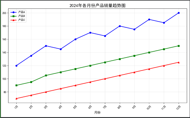 data = {'月份': ['1月', '2月', '3月', '4月', '5月', '6月','7月', '8月', '9月', '10月', '11月', '12月'], # x轴:时间(月份)'产品A': [120, 135, 150, 145, 160, 170, # y轴:产品A每月销量165, 180, 175, 190, 185, 200],'产品B': [90, 95, 105, 110, 115, 120, # 产品B每月销量125, 130, 135, 140, 145, 150],'产品C': [70, 75, 80, 85, 90, 95, # 产品C每月销量100, 105, 110, 115, 120, 125]