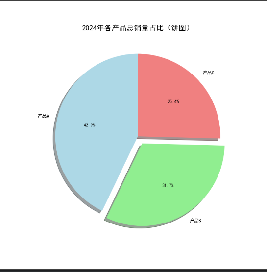 explode = (0, 0.1, 0) # 突出显示第2块(产品B),值越大突出越明显# 3.设置中文字体(防止中文显示为方块)
