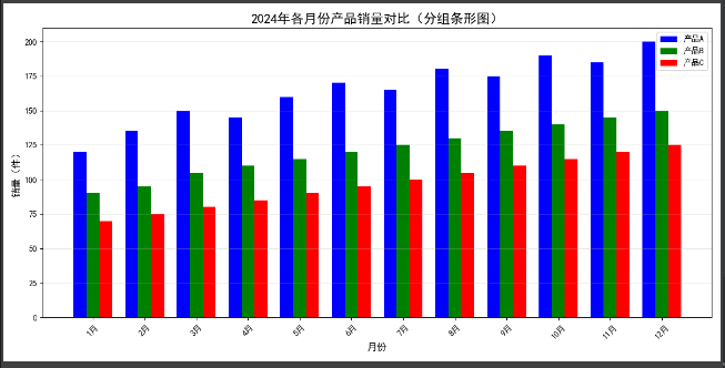 x = np.arange(len(df['月份'])) # [0, 1, 2, ..., 11]# 5.绘制三个产品的条形图,通过调整x的位置实现并排(分组条形图)
