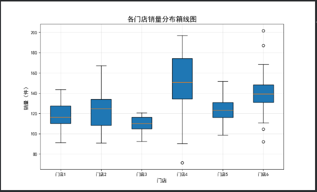 plt.boxplot(data,vert=True, # 垂直箱线图(True:竖直,False:水平)patch_artist=True, # 填充箱体颜色notch=False, # 不显示中位数置信区间凹槽showfliers=True, # 显示异常值(outliers)tick_labels=['门店1', '门店2', '门店3', '门店4', '门店5', '门店6'], # x轴标签