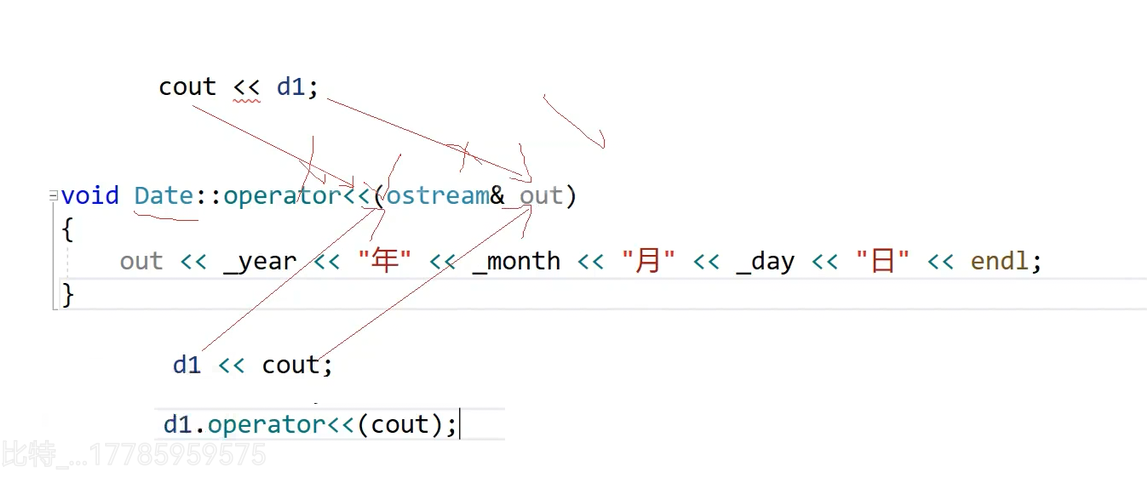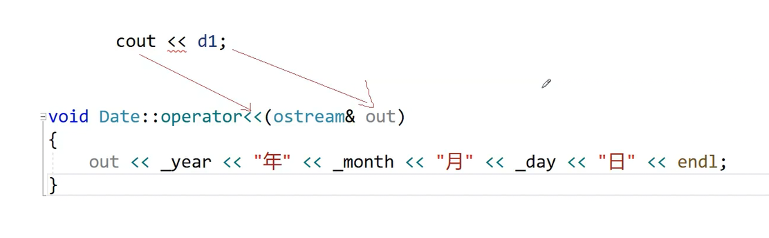 {Date d1, d2;//cin >> d1 >> d2;//cout << d1 << d2;cout << d1;operator<<(cout, d1); //改成全局的才行//T//倒反天罡//d1 << cout;//d1.operator<<(cout);