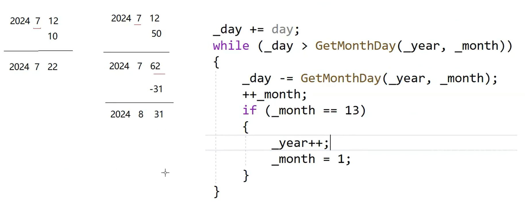 {_day += day; while (_day > GetMonthDay(_year, _month)) //是否超过当前月份的天数{_day -= GetMonthDay(_year, _month); //如果超过了,减掉当前月的天数(相对于当前月过完)++_month;if (_month == 13) //如果月满了{_year++; _month = 1;}}return *this;