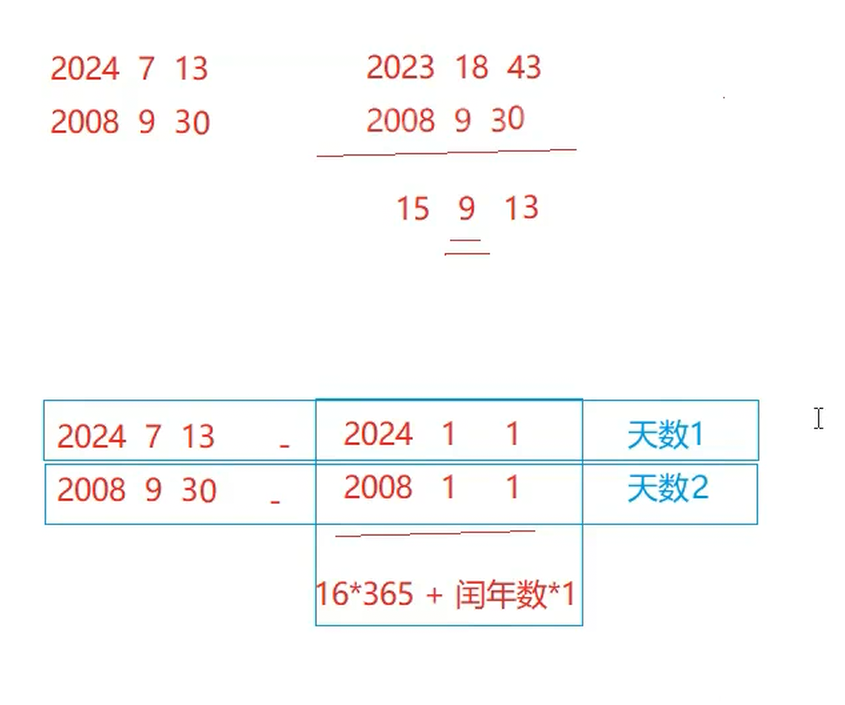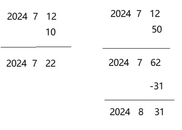 2)日期+天数:满了需要进位,且不止进位一次可能(天满->进位月->月满->进位年)。