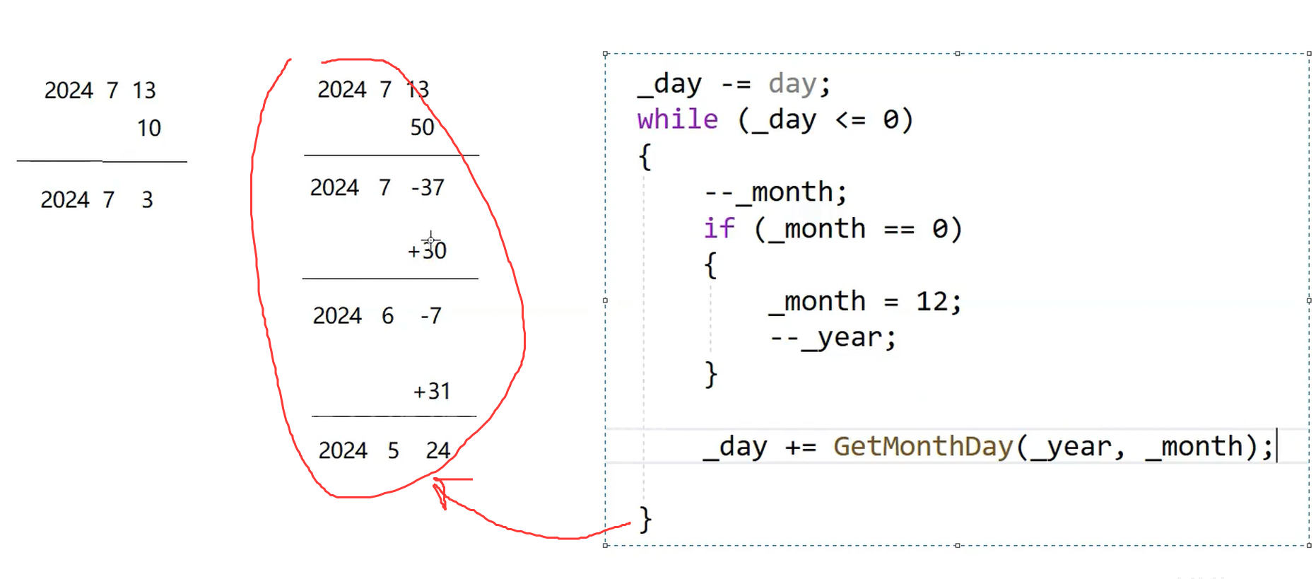 {_day -= day;while (_day <= 0) //不合法,需要借位(月)减出来是负数 / 0 :借位。(比如说7月借6月的,而6月是30天){--_month;if (_month == 0){_month = 12;--_year;}_day += GetMonthDay(_year, _month); //把借位的天数加上}return *this;