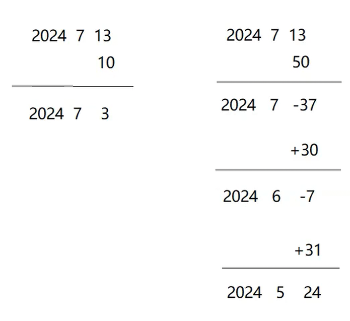 3)日期 - 天数:借位逻辑。(借的是上一个月的)