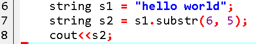 其中,第7行的代码对字符串s1进行截取,从其下标为6的字符开始截取,一共截取5个字符,并且把截取得到的字符保存到字符串s2中。s2的值是“world”。