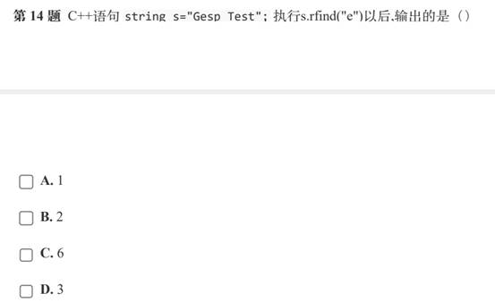 在“4 string的查找”中提到,string类的rfind()作用是从右向左查找字符,因此,s.rfind(“e”)查找到的是s中Test的“e”,其下标是6。因此,本题的答案是C。