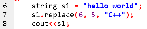 其中,第7行代码表示从字符串s1的下标为6的字符开始替换,替换的长度为5,即下标6-10的字符替换为“C++”。代码运行的效果如图10所示。
