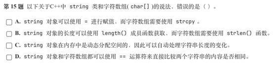 根据以上操作string的方法以及《GESP C++等级认证三级10-操作字符数组2-1》和《GESP C++等级认证三级11-操作字符数组2-2》中介绍的操作字符数组的方法可知,选项D中,string对象可以用“==”关系运算符来比较两个字符串内容是否相等,而对于字符数组来说,要通过strcmp()函数来进行比较,因此D选项说法错误,答案选择D。
