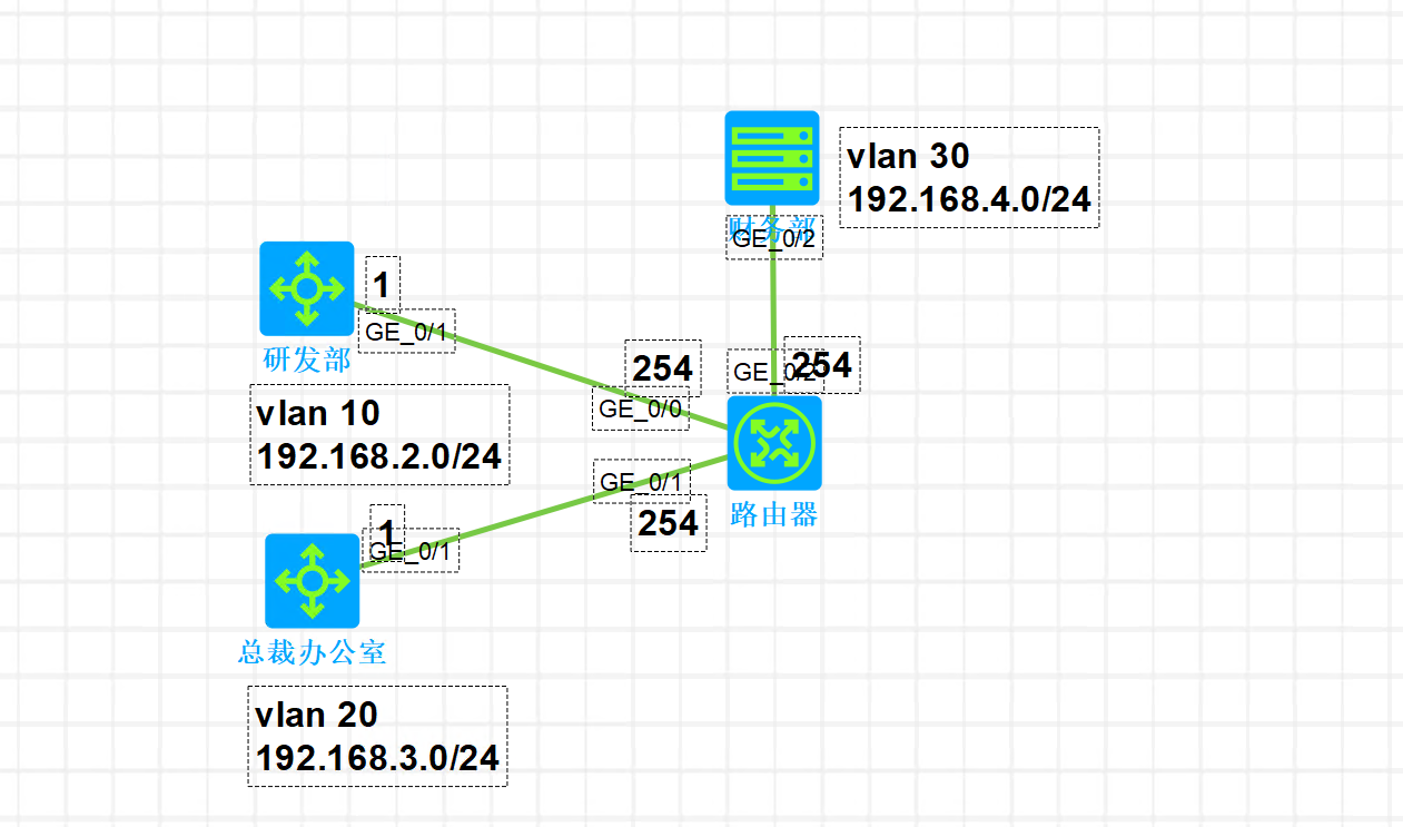 比如图示的网络需求中,只有总裁办公室的网络能访问财务部,其它部门禁止访问,即可以用ACL策略来快速实现。