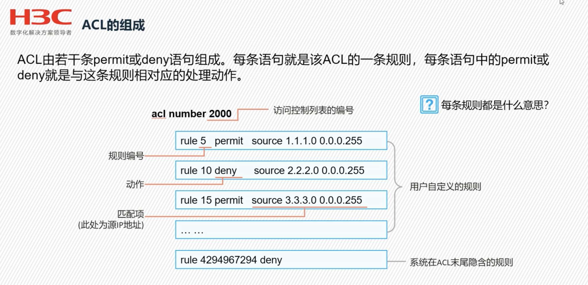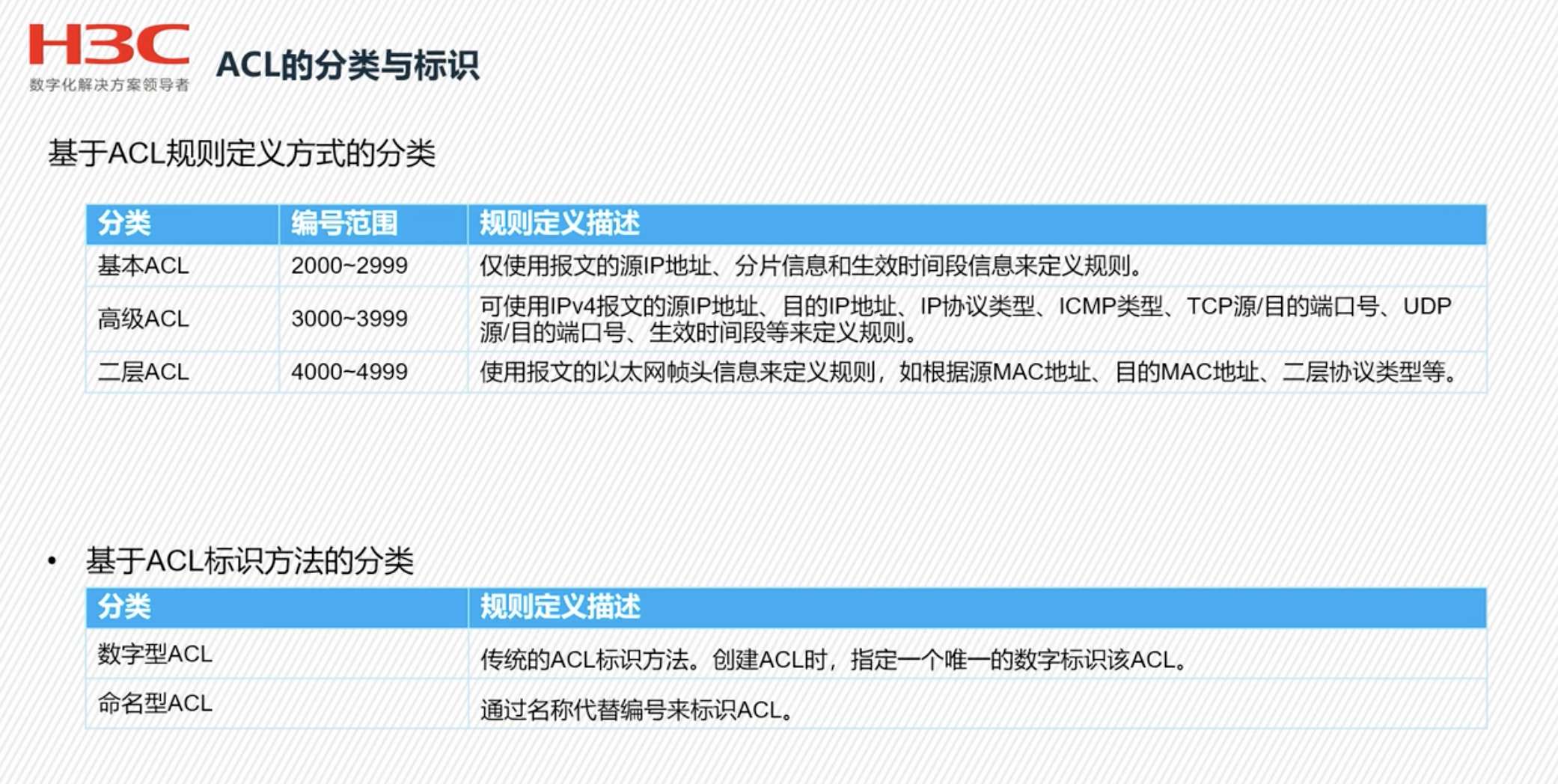 在H3C中,基于ACL规则方式的分类有三种,分别为: