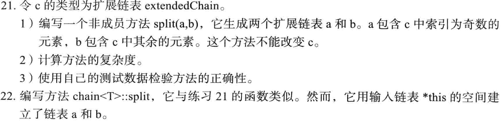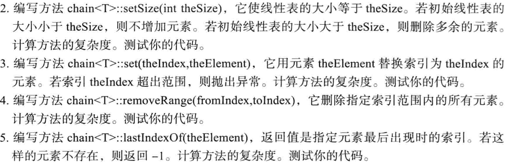 {public:// constructor and copy constructorextendedChain(int initialCapacity = 10) :chain<T>(initialCapacity) {}extendedChain(const extendedChain<T>& c) :chain<T>(c) {}// ADT methodsbool empty() const {return listSize == 0;}int size() const {return listSize;}T& get(int theIndex) const{return chain<T>::get(theIndex);}int indexOf(const T& theElement) const{return chain<T>::indexOf(theElement);}void erase(int theIndex);void insert(int theIndex, const T& theElement);void clear(){// Delete all nodes in chain.while (firstNode != NULL){// delete firstNodechainNode<T>* nextNode = firstNode->next;delete firstNode;firstNode = nextNode;}listSize = 0;}void push_back(const T& theElement);void output(ostream& out) const{chain<T>::output(out);}// additional methodvoid zero(){firstNode = NULL; listSize = 0;}protected:chainNode<T>* lastNode; // pointer to last node in chain