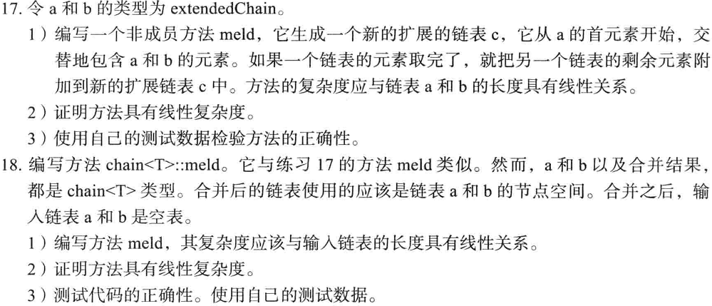 extendedChain<T> meld(const extendedChain<T>& a, const extendedChain<T>& b) {extendedChain<T> c;int i = 0, j = 0;bool takeA = true;while (i < a.size() || j < b.size()) {if (takeA && i < a.size()) {c.insert(c.size(), a.get(i)); // 取a的元素,插入到c末尾i++;} else if (j < b.size()) {c.insert(c.size(), b.get(j)); // 取b的元素,插入到c末尾j++;}takeA = !takeA; // 切换取a/b的标记}return c;