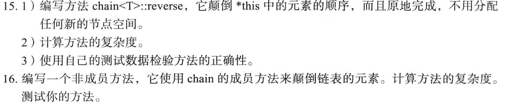 void reverseChain(chain<T>& c) {chain<T> temp;int n = c.size();// 从原链表最后一个元素开始,依次插入到temp的头部for (int i = n - 1; i >= 0; --i) {temp.insert(0, c.get(i));}// 清空原链表并复制temp的内容while (!c.empty()) {c.erase(0);}for (int i = 0; i < n; ++i) {c.insert(i, temp.get(i));}