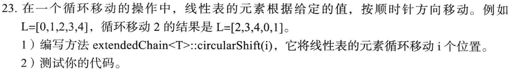 void extendedChain<T>::circularShift(int i) {int n = listSize;if (n <= 1) return; // 空链表或单元素,无需移动// 处理i的范围:取模转为有效偏移(0 ≤ i < n)i = i % n;if (i < 0) i += n;if (i == 0) return; // 偏移0,无需操作// 步骤1:找到第 n-i 个节点(它的下一个节点将成为新头)chainNode<T>* prev = firstNode;for (int j = 0; j < n - i - 1; ++j) {prev = prev->next;}// 步骤2:记录新头、原尾,并重组链表chainNode<T>* newFirst = prev->next; // 新头是第 n-i 个节点的下一个chainNode<T>* tail = newFirst; // 找原链表的尾节点while (tail->next != nullptr) {tail = tail->next;}tail->next = firstNode; // 原尾连原头,形成临时循环prev->next = nullptr; // 断开原链表,新头的前驱置空firstNode = newFirst; // 更新头节点