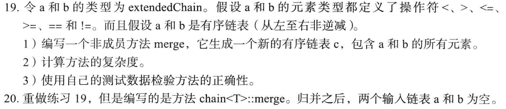 extendedChain<T> merge(const extendedChain<T>& a, const extendedChain<T>& b) {extendedChain<T> c;int i = 0, j = 0;// 同时遍历a和b,选较小元素插入cwhile (i < a.size() && j < b.size()) {if (a.get(i) < b.get(j)) {c.insert(c.size(), a.get(i++));} else {c.insert(c.size(), b.get(j++));}}// 拼接a的剩余元素while (i < a.size()) c.insert(c.size(), a.get(i++));// 拼接b的剩余元素while (j < b.size()) c.insert(c.size(), b.get(j++));return c;