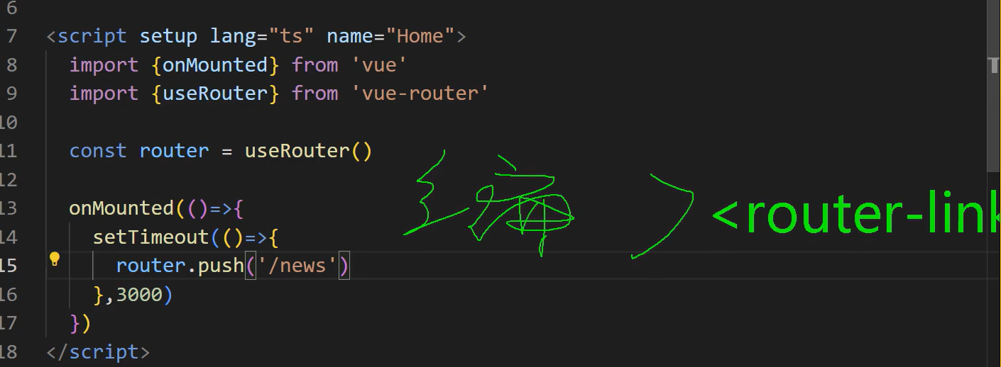 import { useRouter } from 'vue-router'const router = useRouter()const gotoHome = () => {router.push('/') // 字符串路径