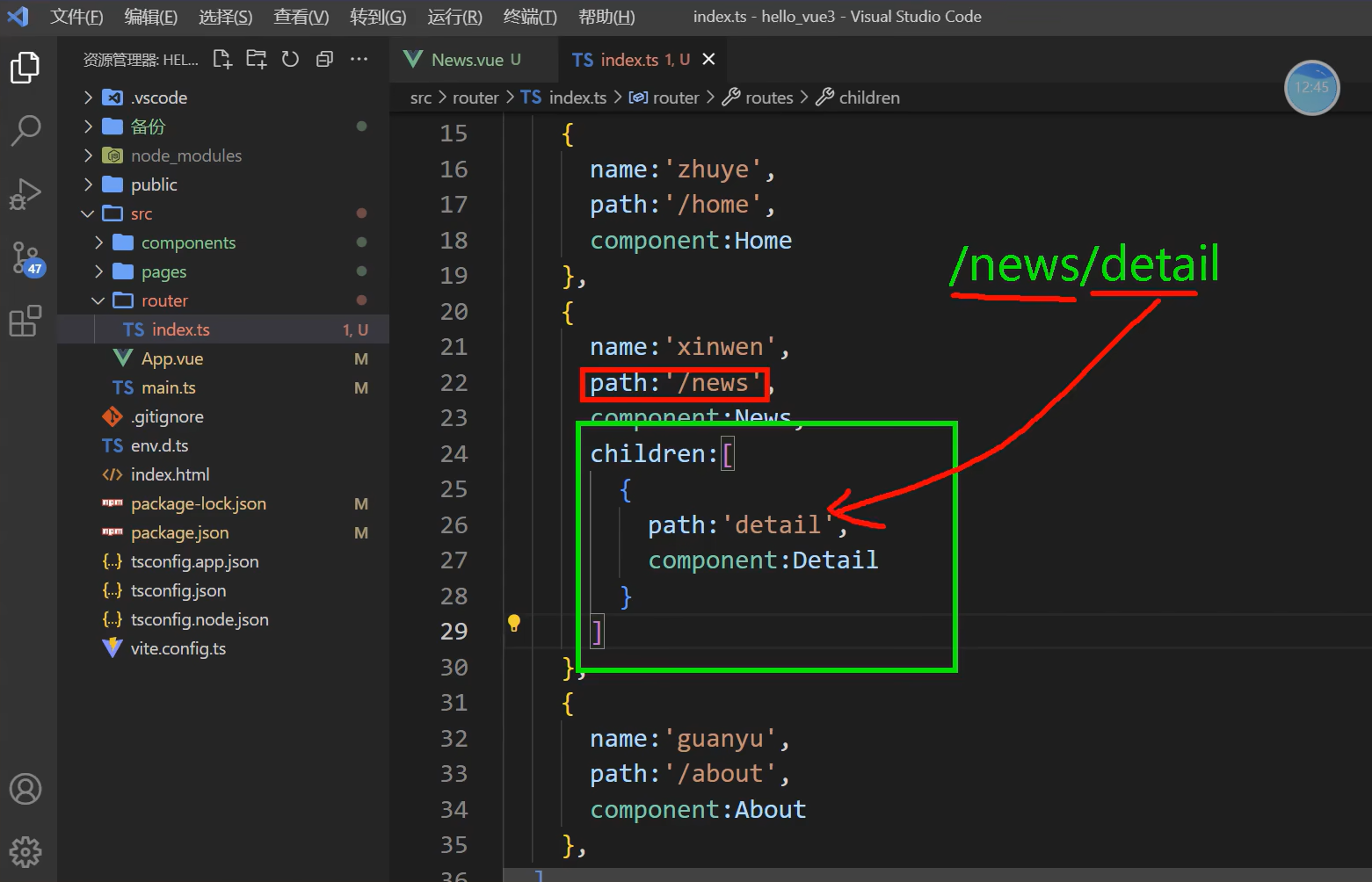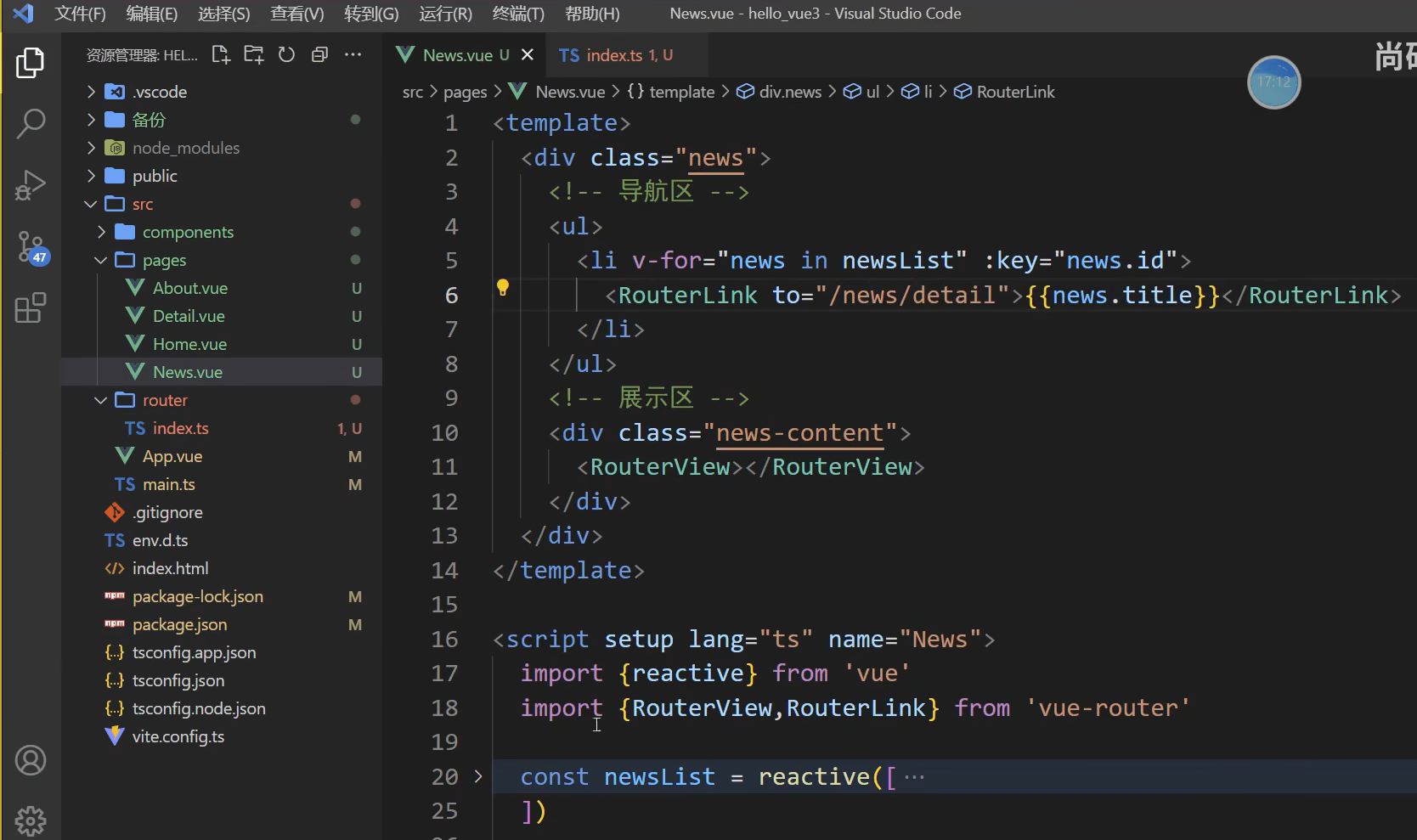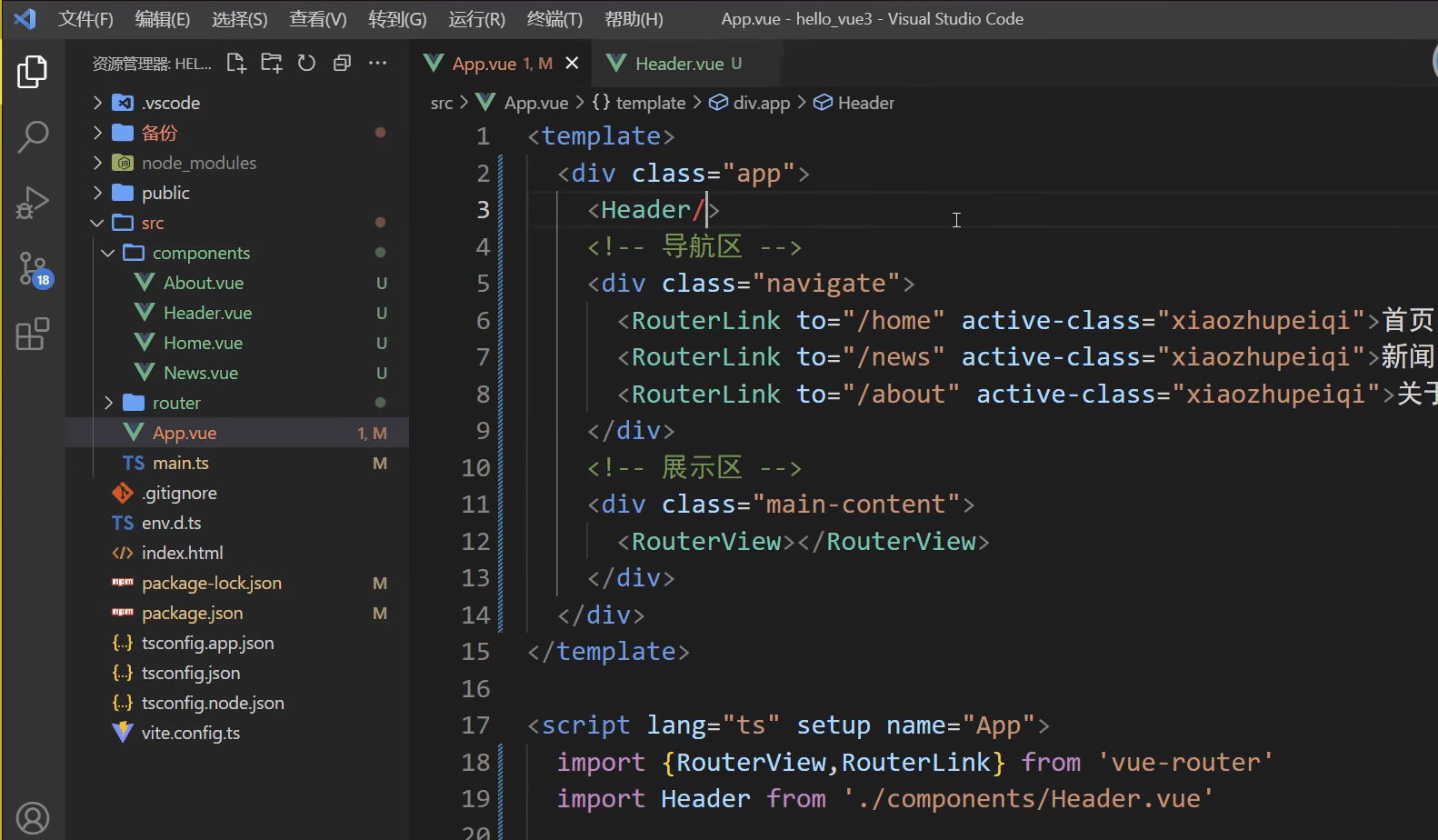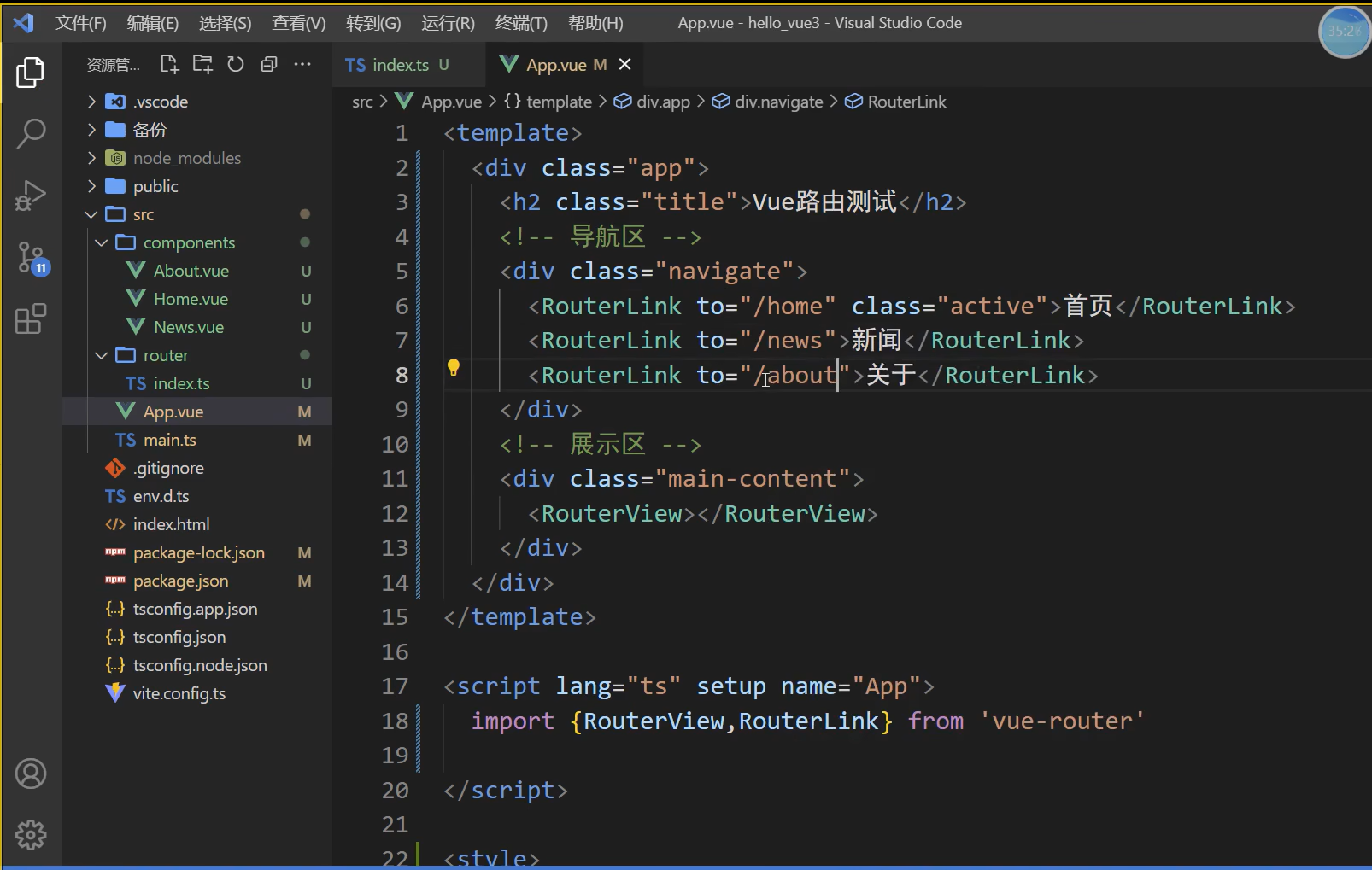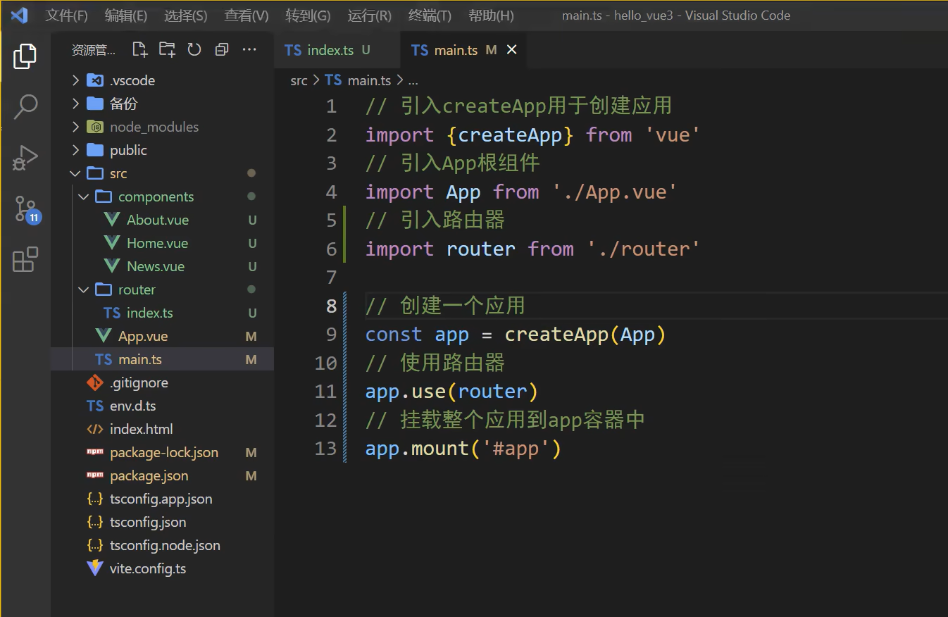 // main.jsimport { createApp } from 'vue'import App from './App.vue'import router from './router'const app = createApp(App)app.use(router) // 挂载路由app.mount('#app')